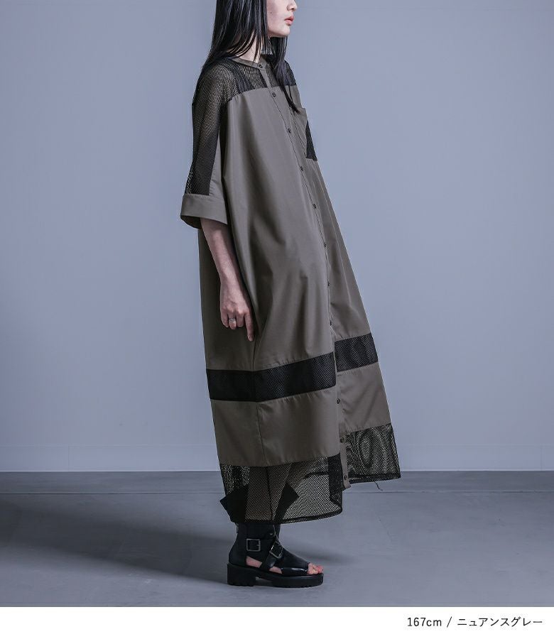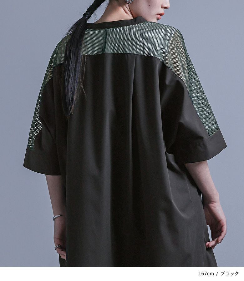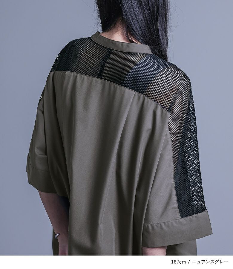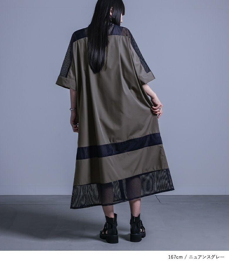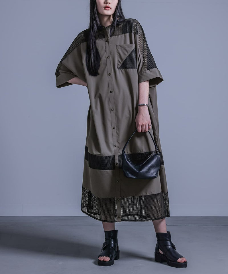 肩と裾を微配色のメッシュで切り替えた異素材ワンピース。胸ポケットと膝部分のメッシュは布帛の上に配置し透けない仕様に。ゆるっとしたシルエットで、ラフに一枚着るだけでお洒落が完成します。両サイドポケット付きなのも嬉しいポイント。