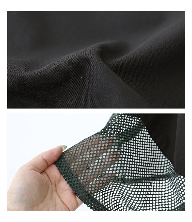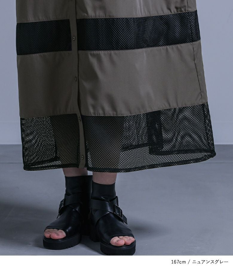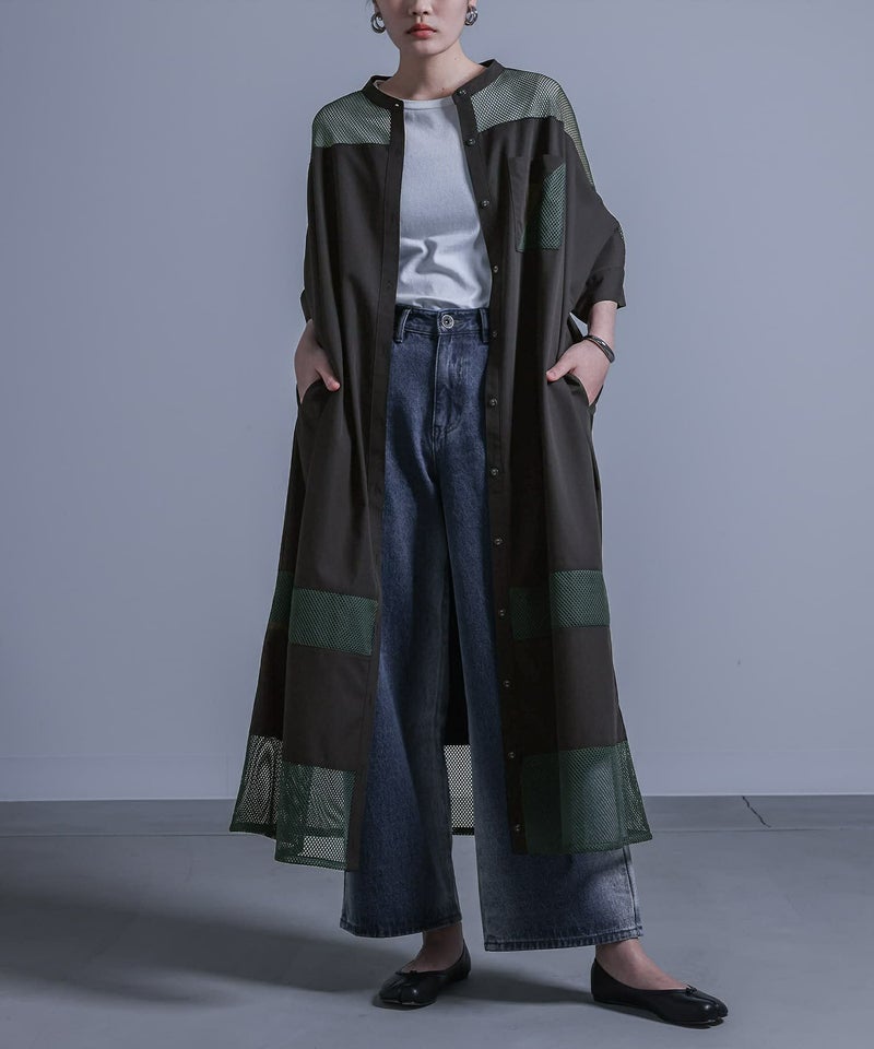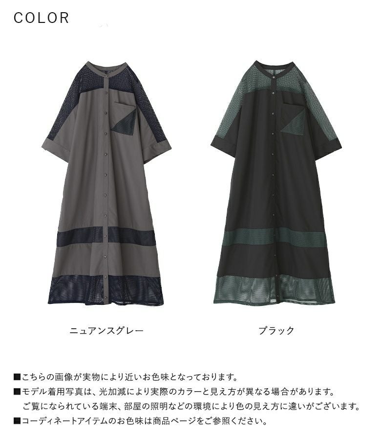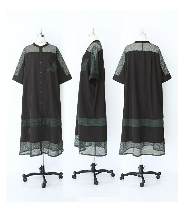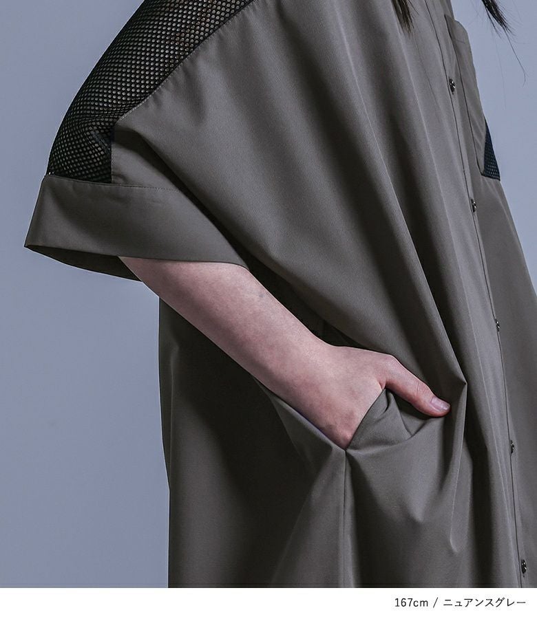 肩と裾を微配色のメッシュで切り替えた異素材ワンピース。胸ポケットと膝部分のメッシュは布帛の上に配置し透けない仕様に。ゆるっとしたシルエットで、ラフに一枚着るだけでお洒落が完成します。両サイドポケット付きなのも嬉しいポイント。