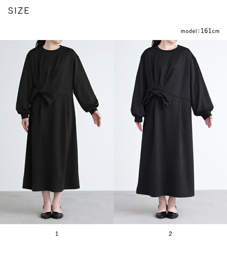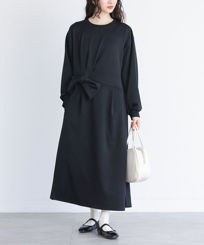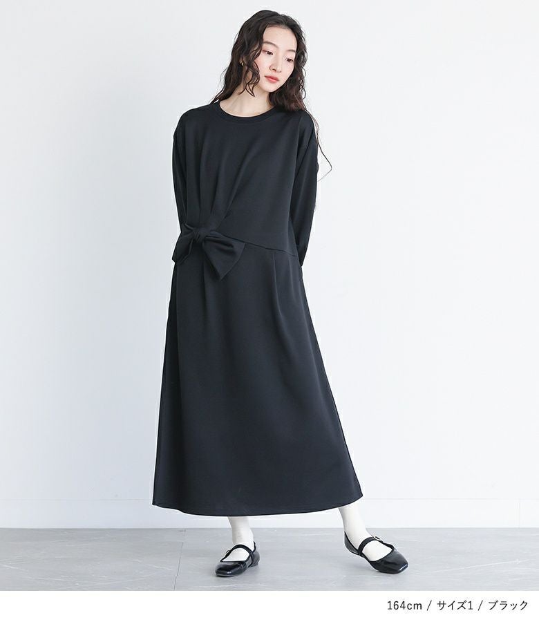 ウエストのボリューミーなリボンモチーフが目を惹くワンピース。カジュアルにも着用できるよう、リブ切り替え仕様の袖口と襟ぐりもポイントです。首元からリボンモチーフにかけてのギャザーがウエストマークになりスタイルアップも期待できます。