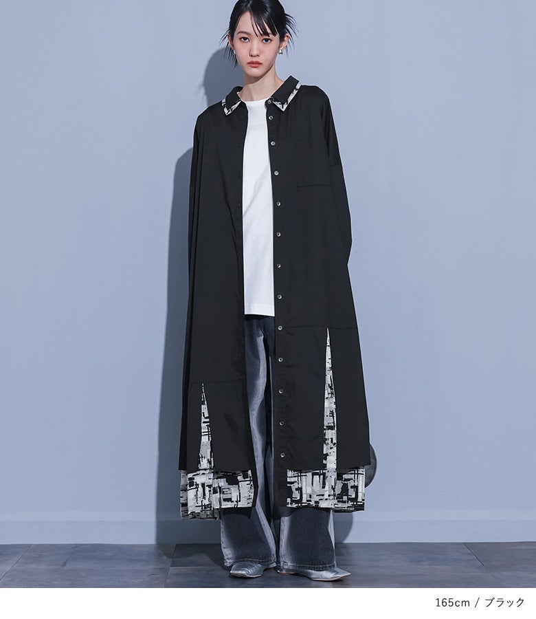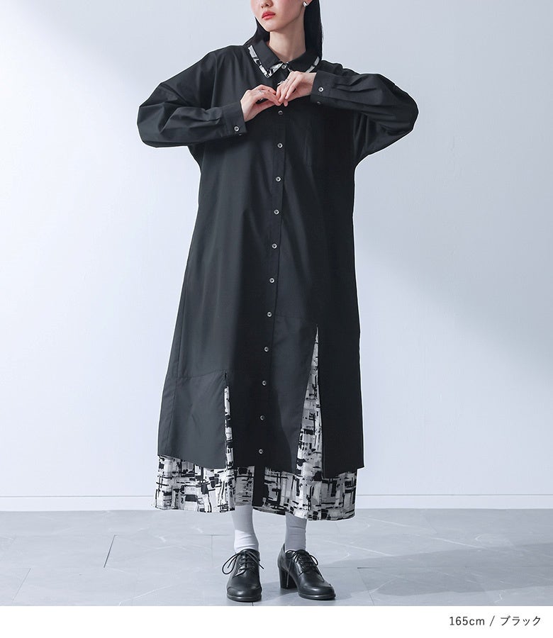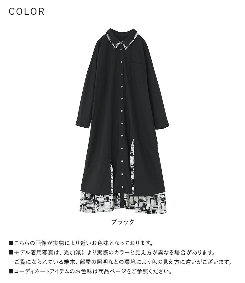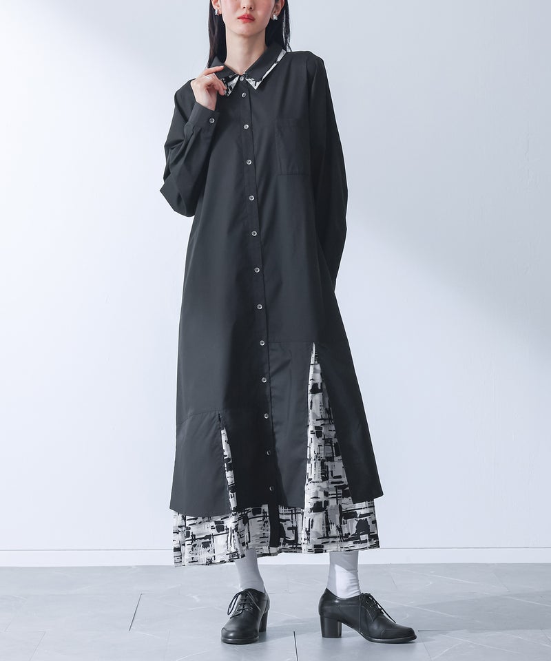 襟元と裾にモノトーンのニュアンス柄を組み合わせたシャツワンピース。
