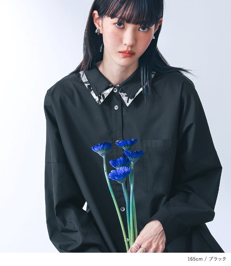 無地のシャツワンピースの襟元と裾に、モノトーンのニュアンス柄を組み合わせた一着。顔周りと足元にさりげなく柄を置くことで、派手になりすぎず洗練された印象を与えます。日常を格上げする、一枚で着映えするアイテムです。