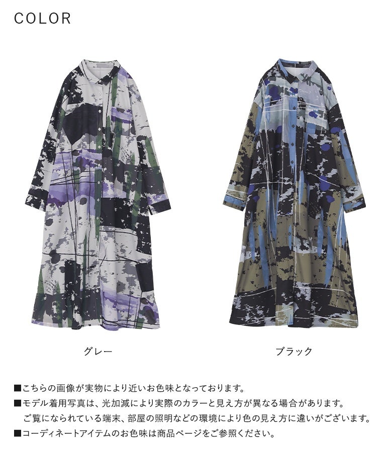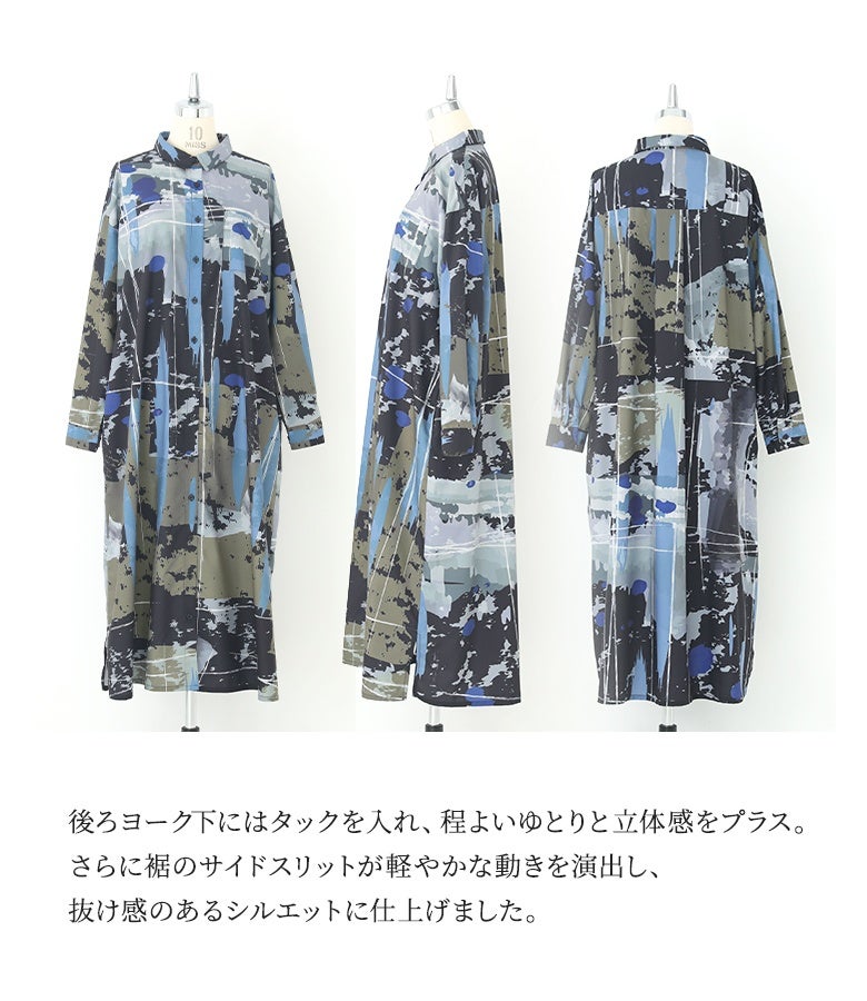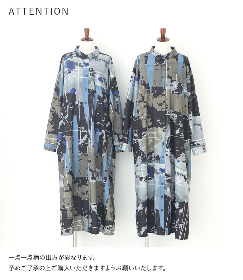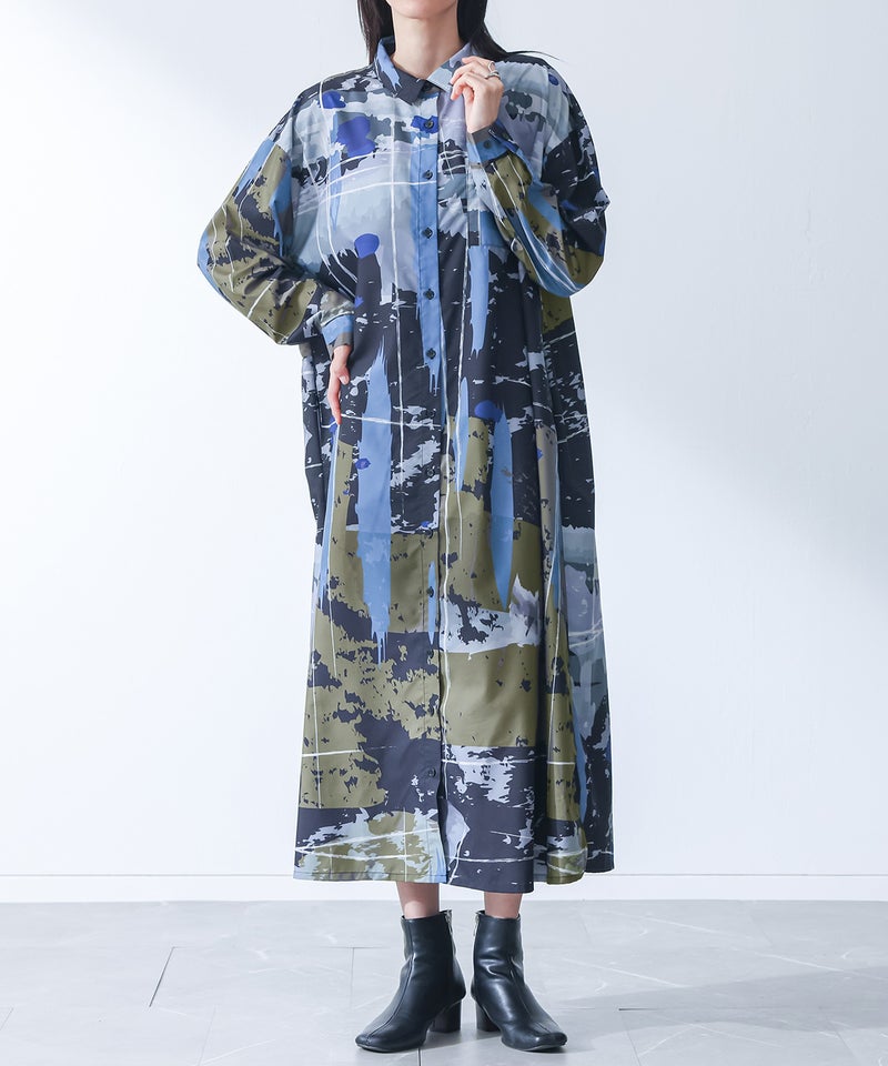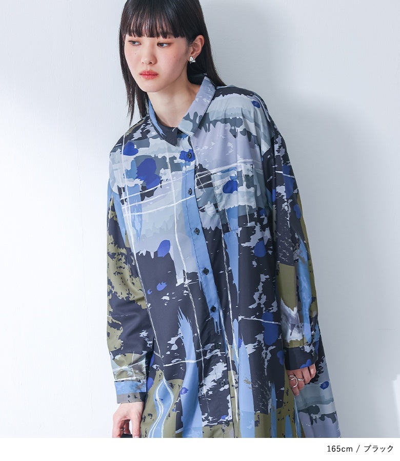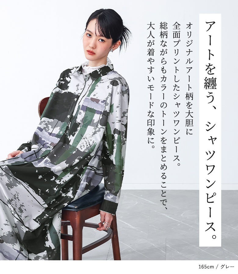 オリジナルアート柄を大胆に全面プリントしたシャツワンピース。