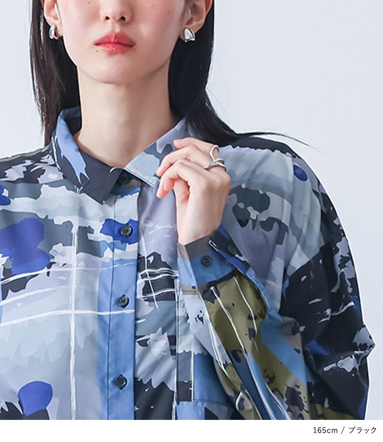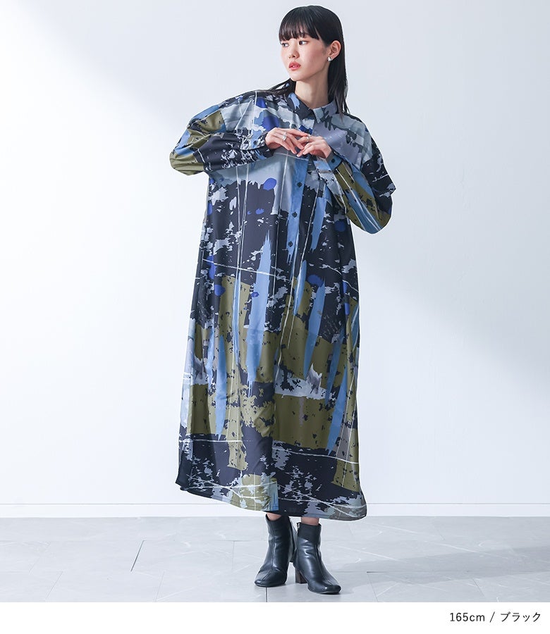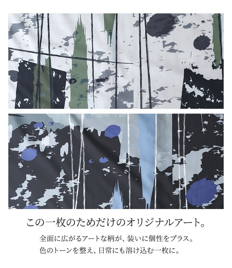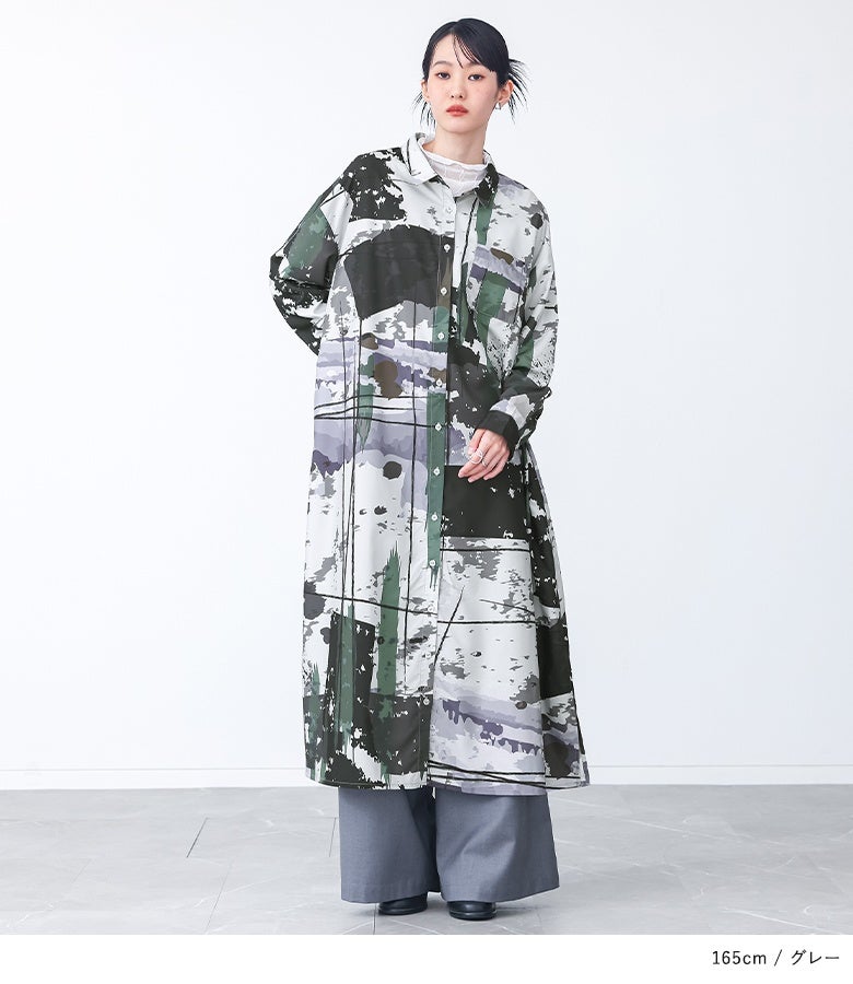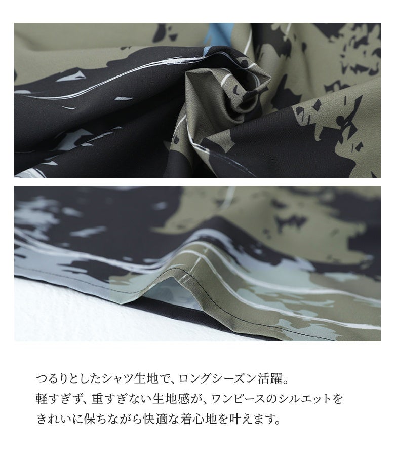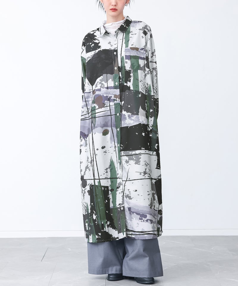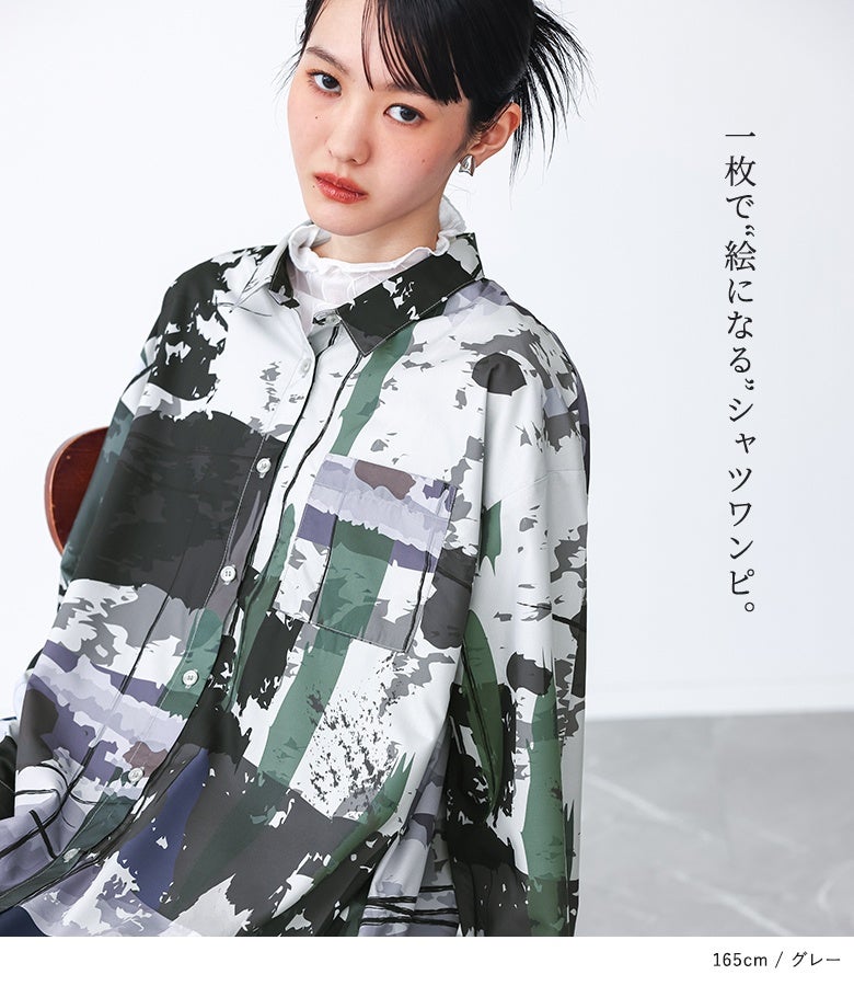 オリジナルアート柄を大胆に全面プリントしたシャツワンピース。