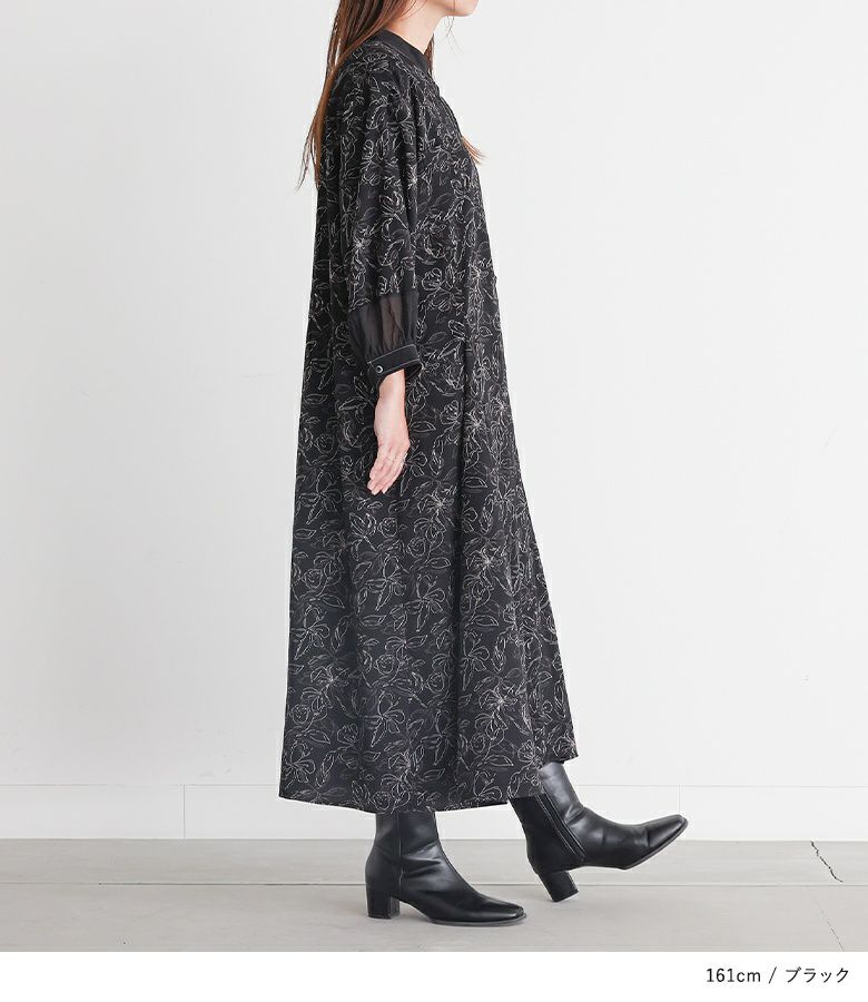 目を引く華やかな線画タッチの大柄プリントワンピース。袖口切替は無地のシアー生地を使用しているので抜け感のある印象に。