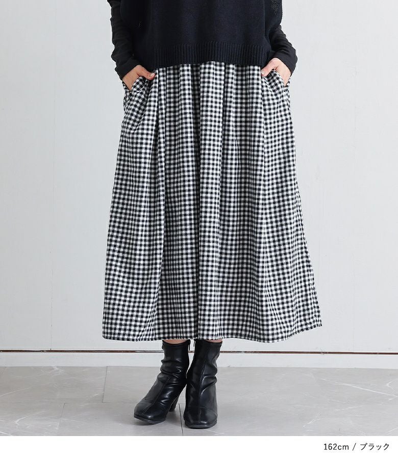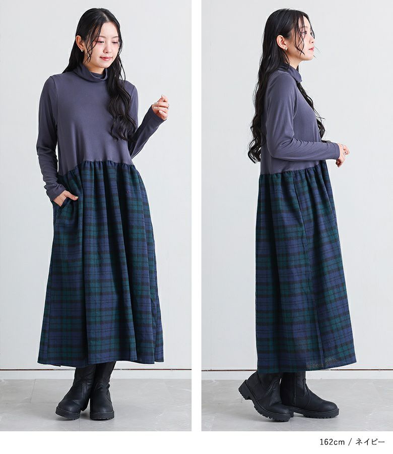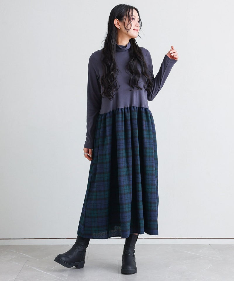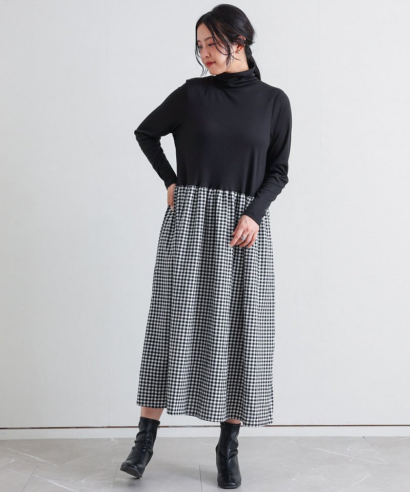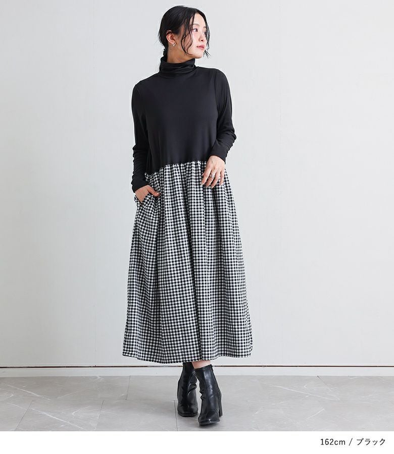きちんと感のあるタートルネックドッキングワンピース。スカート部分はボリュームがありながらも重たくなりすぎず、動きやすいデザインです。