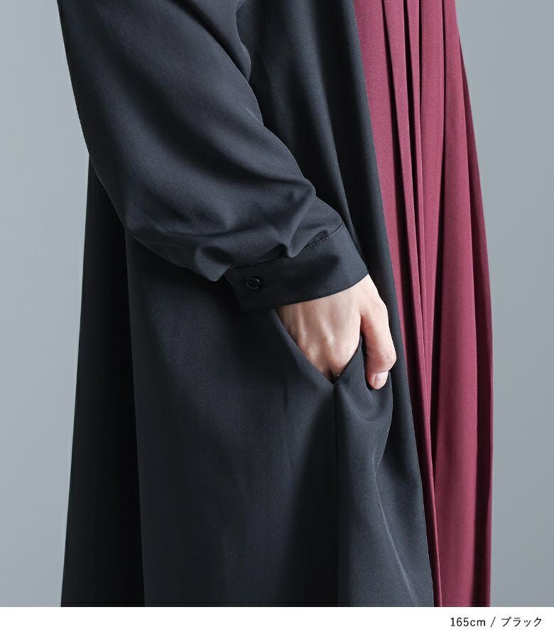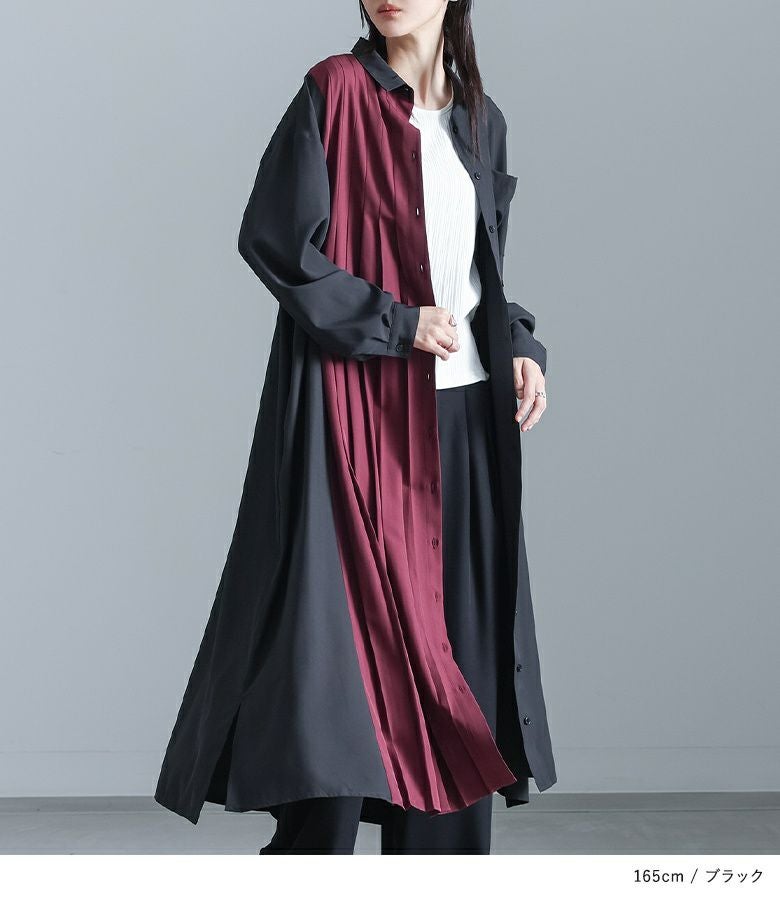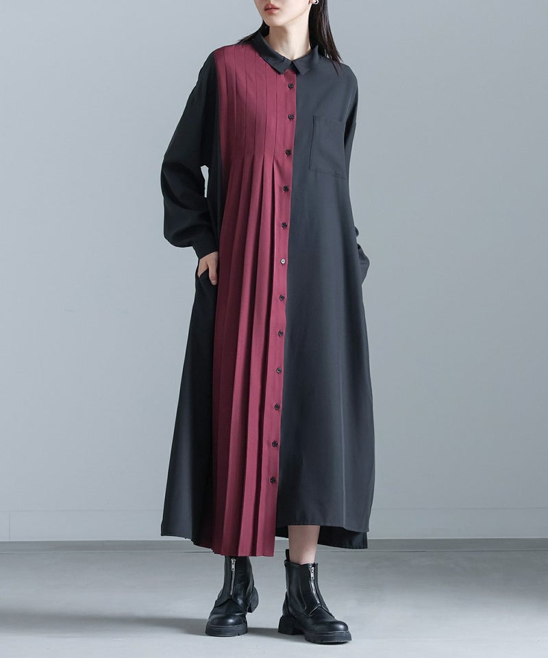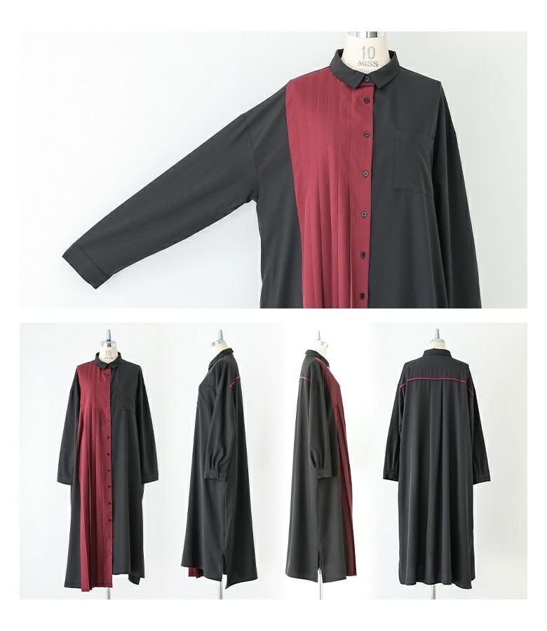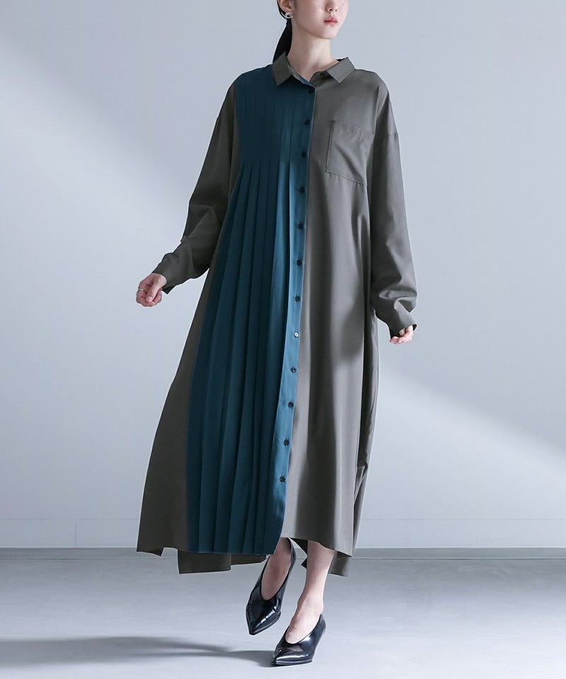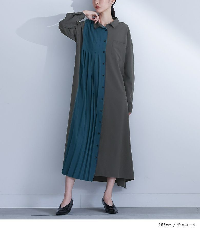 【チャコールのみ販売】配色プリーツの切り替えが印象的なシャツワンピース。