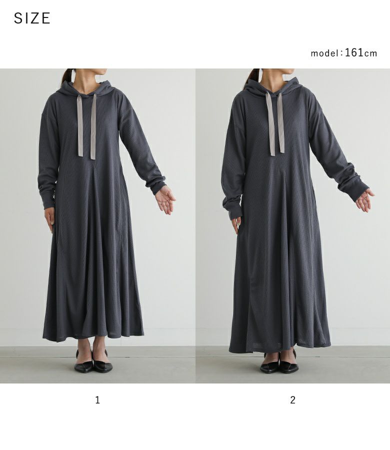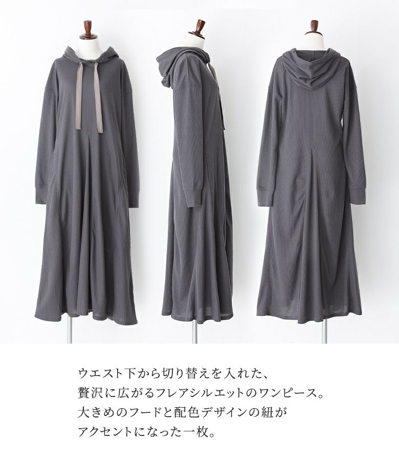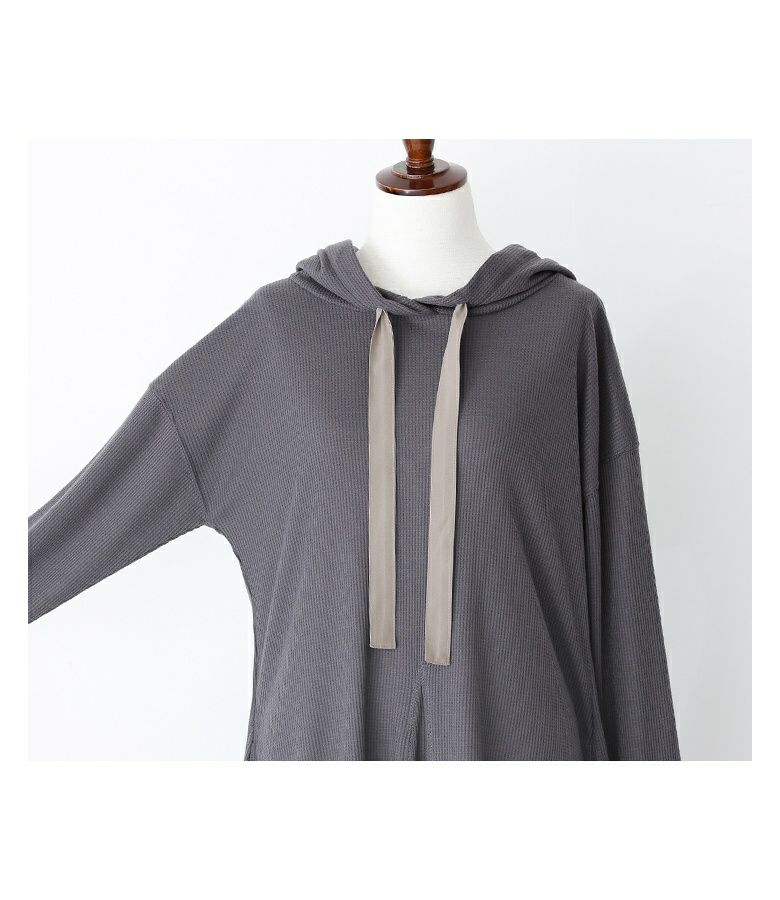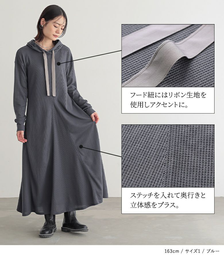 柔らかいワッフル素材で、リラックスした着心地です。配色のフードリボンが可愛らしく、1枚でさらっと着るだけでサマになるワンピースです。