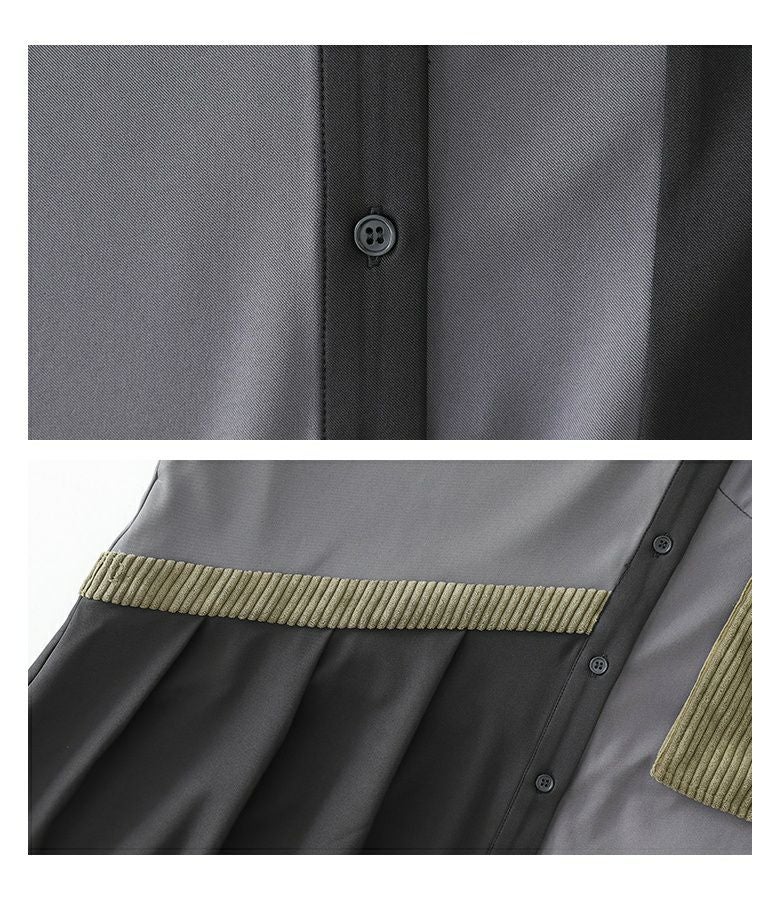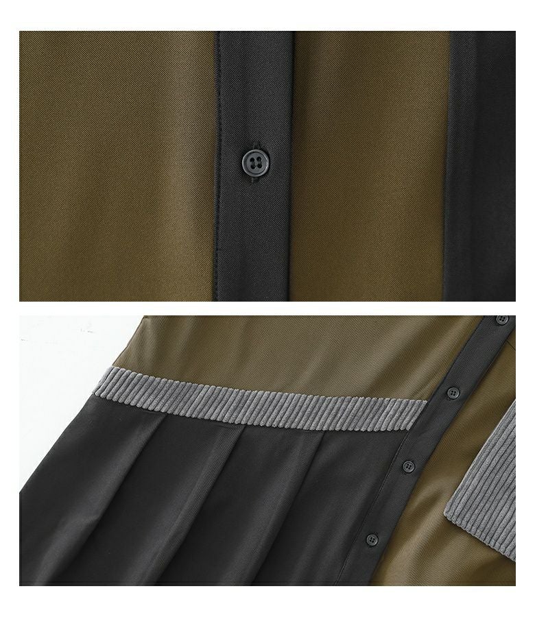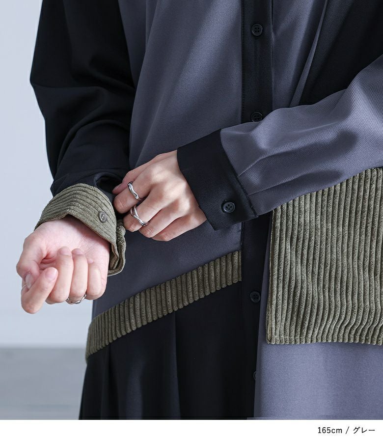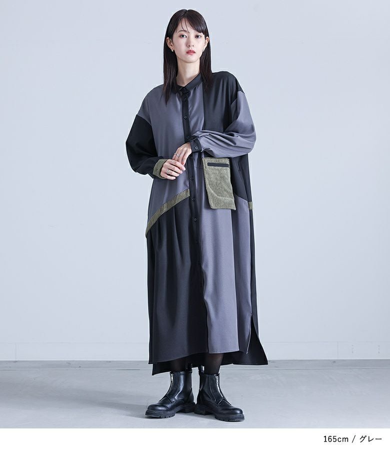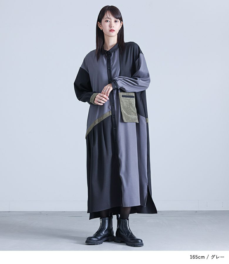 3配色の切り替えがお洒落なシャツワンピースです。ポイントとなる配色部分には、太めの畝のコーデュロイ素材を使用し、前身頃にはパッチポケットを配置。あえて袋布を浮かせたようなこだわりのデザイン。右身頃から後身頃にかけて続くラインがアクセントになり、その下にはタックをとることで、全体がのっぺりとした印象ならずに着られます。