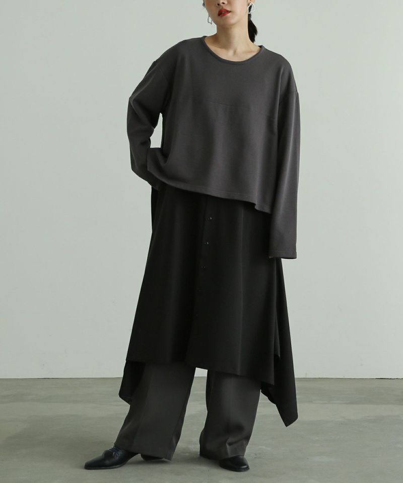 カットソーとシャツをドッキングした長袖ワンピース。