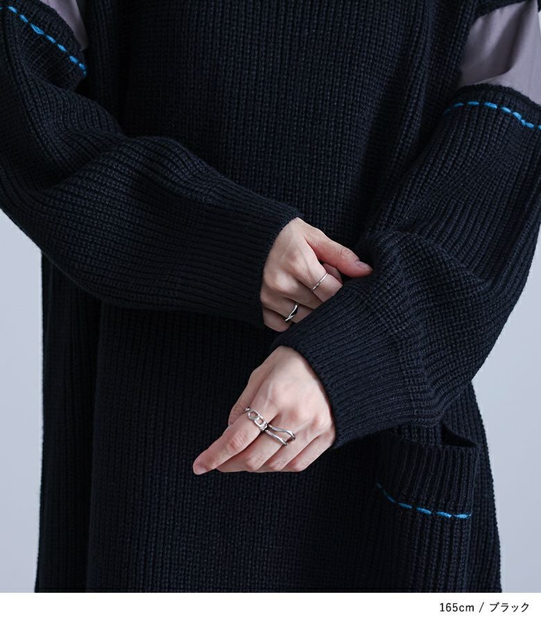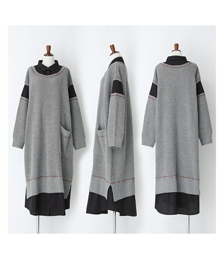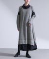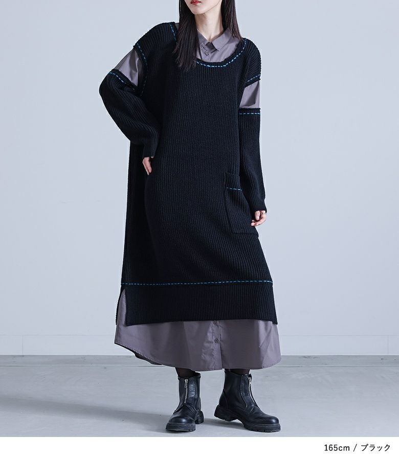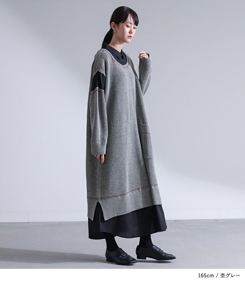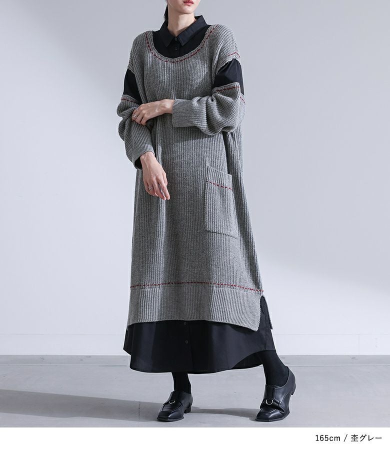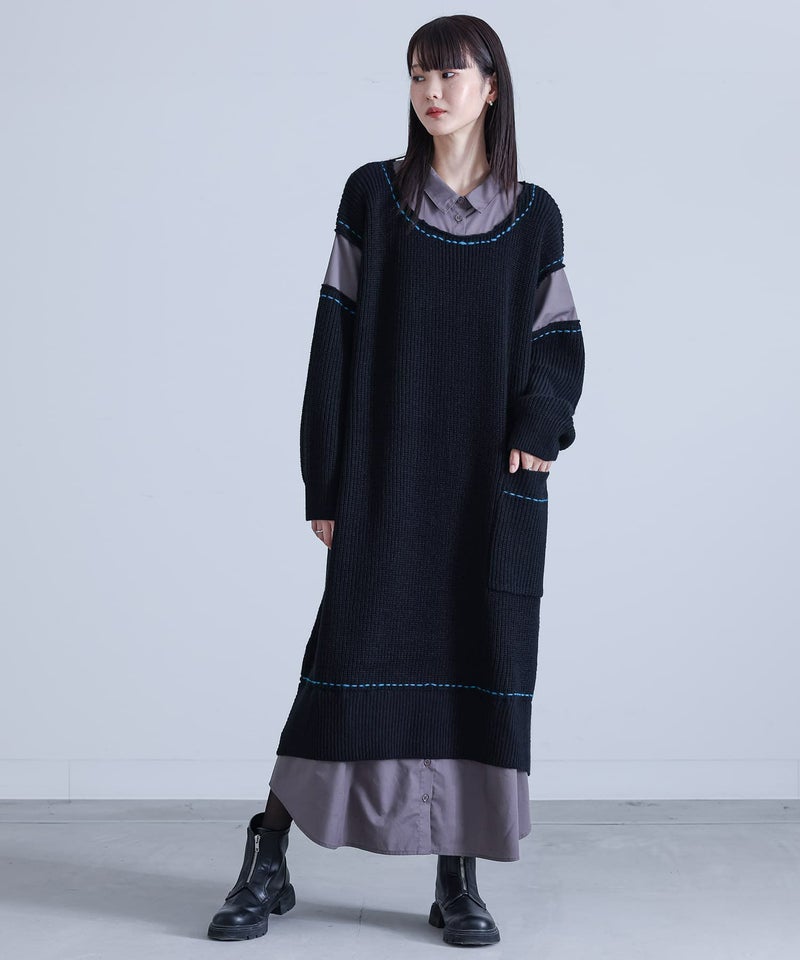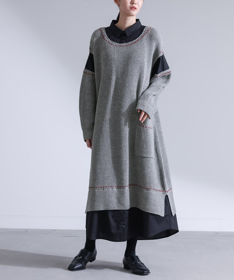 レイヤードスタイルに見えるニットワンピース。襟ぐり、裾、袖から布帛をちらりとのぞかせたデザインです。手刺繍での配色ステッチと、あえて片方だけにしたポケットがアクセントに。