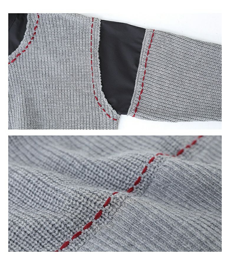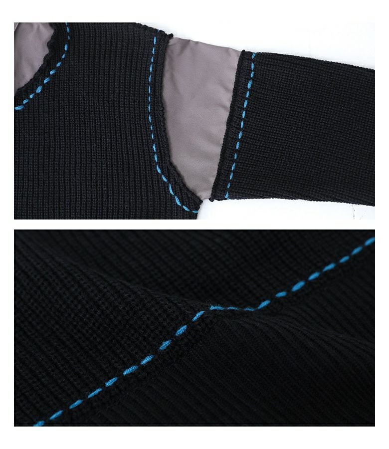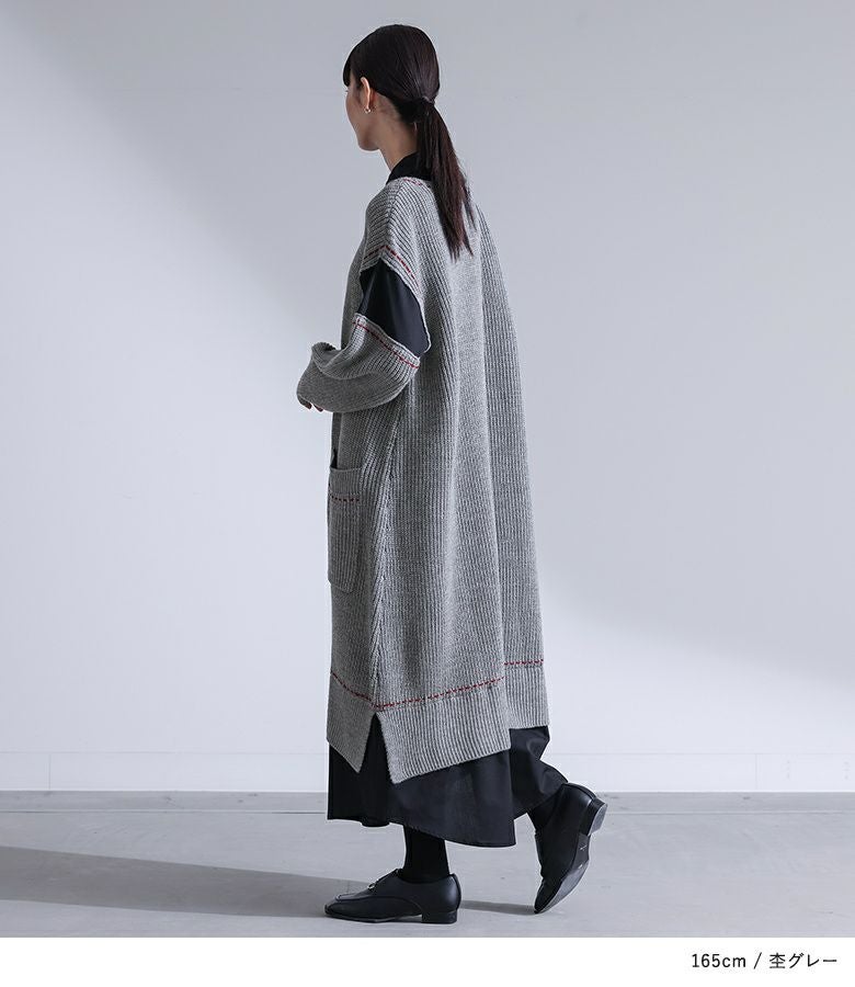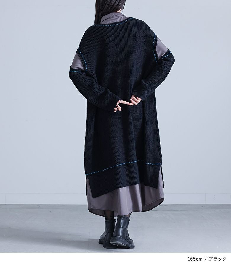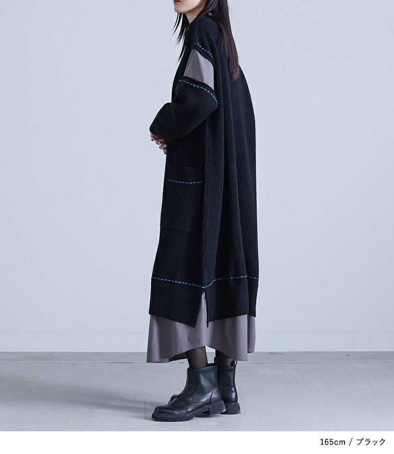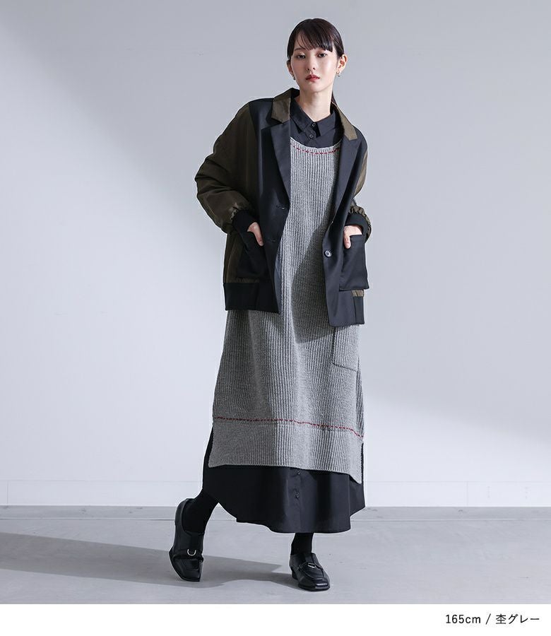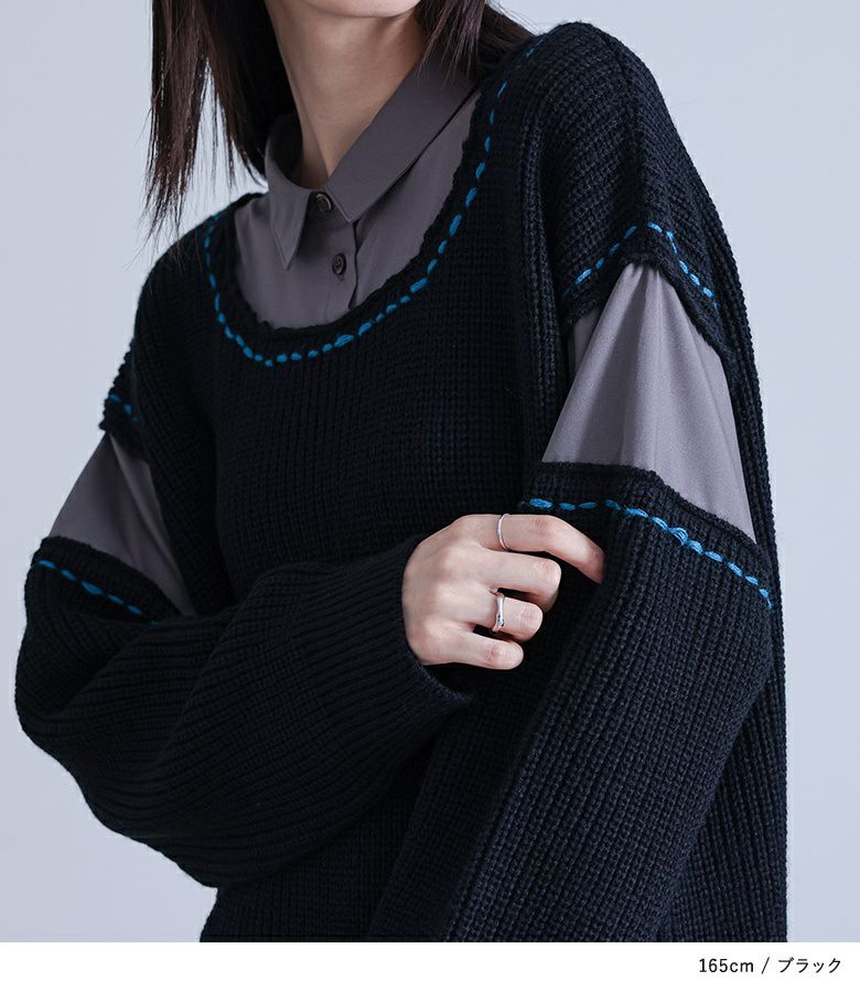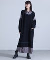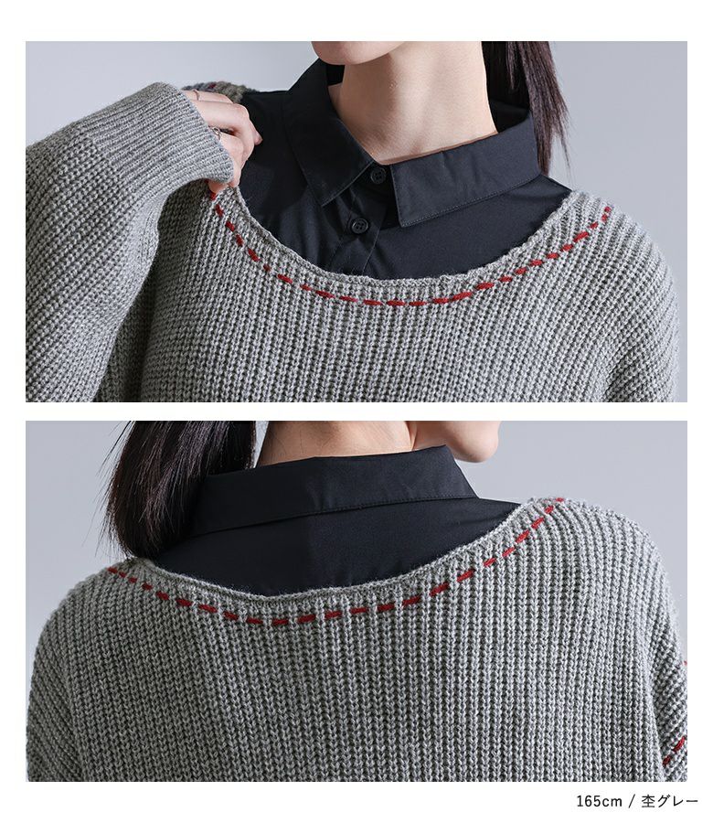 レイヤードスタイルに見えるニットワンピース。襟ぐり、裾、袖から布帛をちらりとのぞかせたデザインです。手刺繍での配色ステッチと、あえて片方だけにしたポケットがアクセントに。