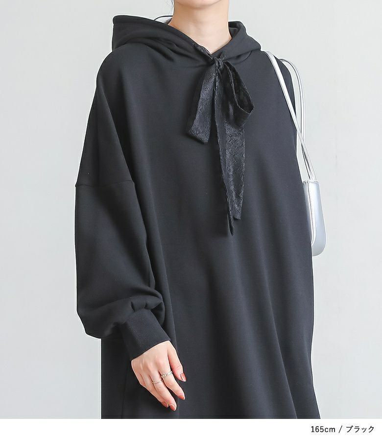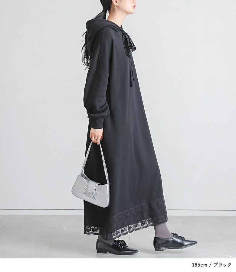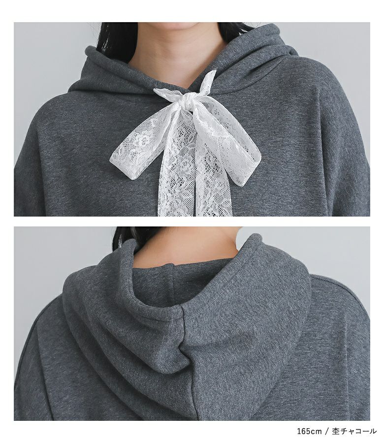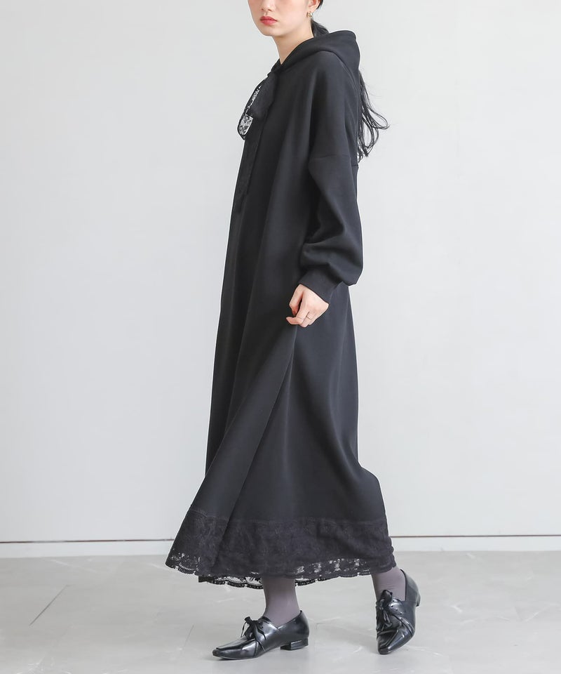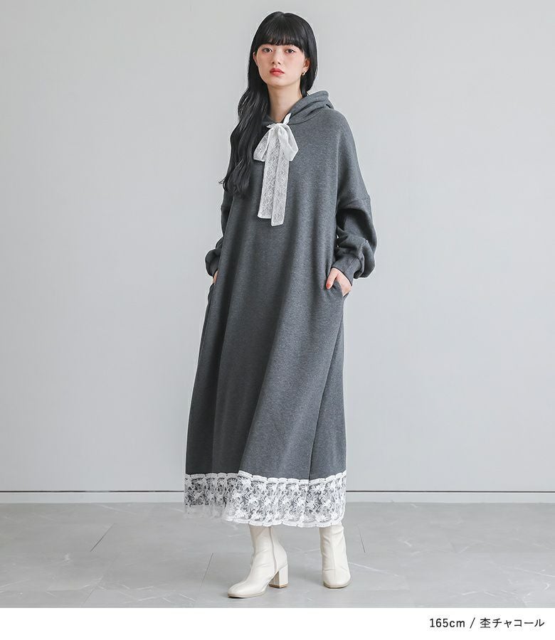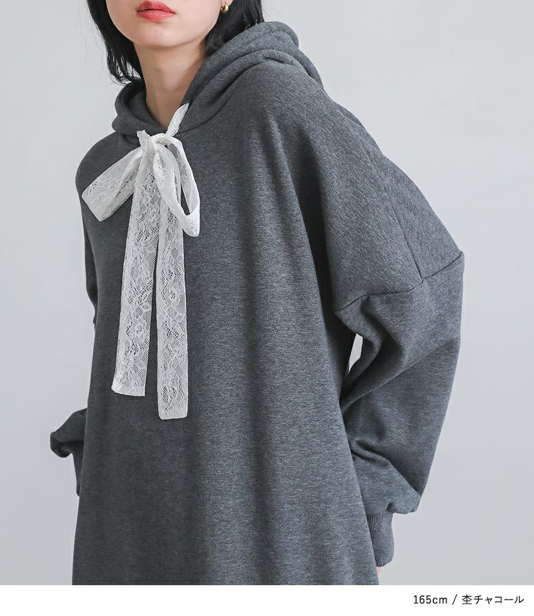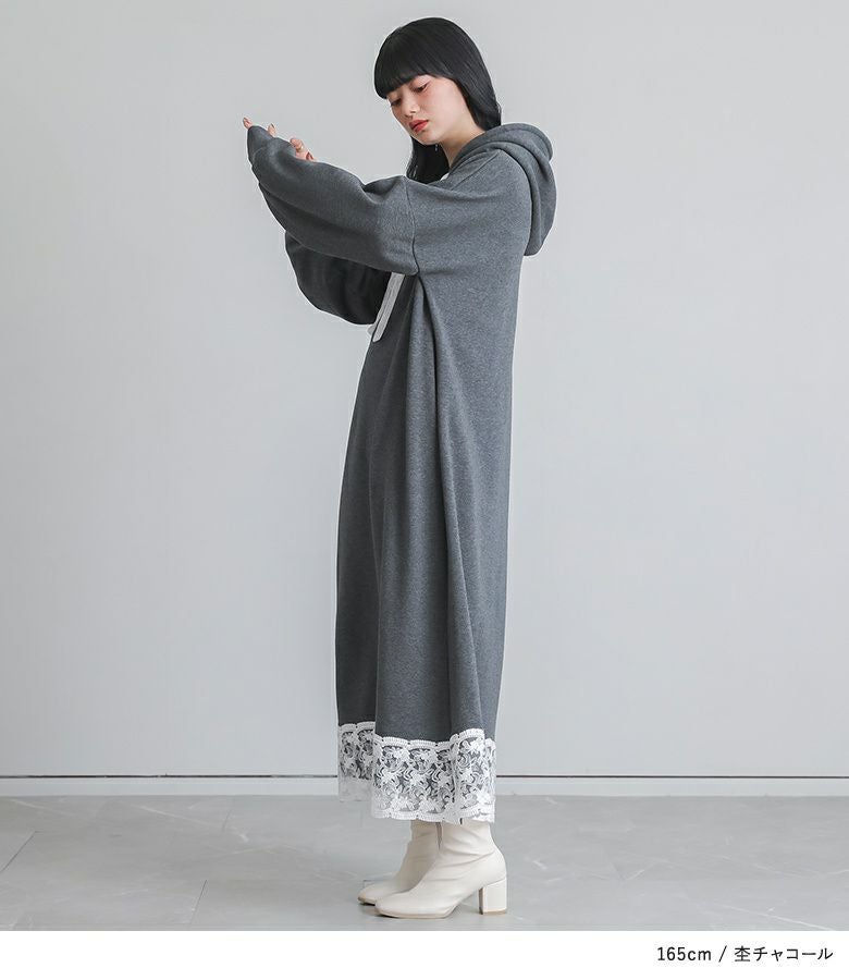 あたたかい裏シャギー生地を使用したワンピース。フードの紐、裾にレースを贅沢にあしらった印象的なデザインに仕立てました。カジュアルな印象のパーカーワンピースにレースをプラスし周りと差のつく雰囲気のあるお洒落が完成。