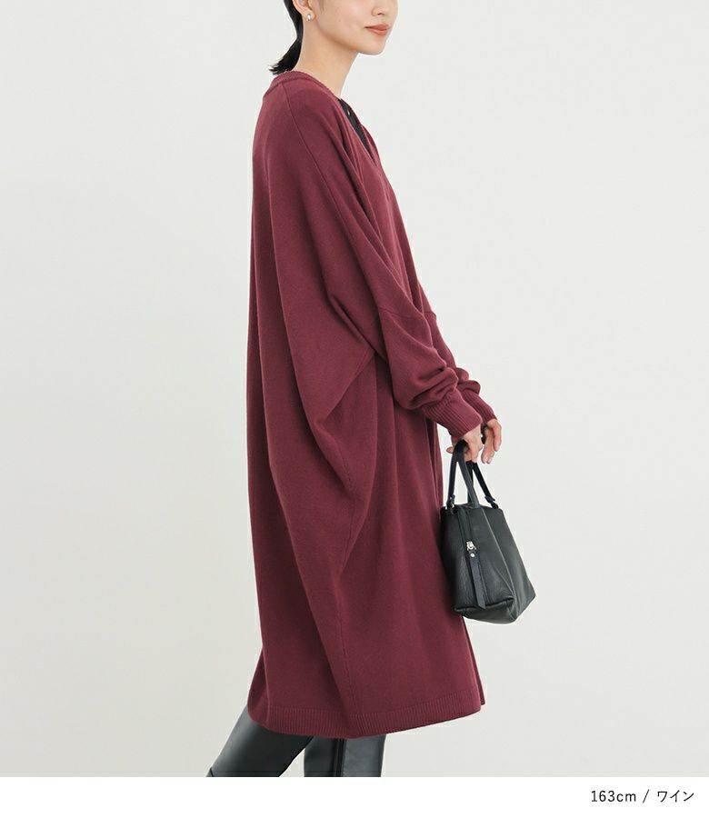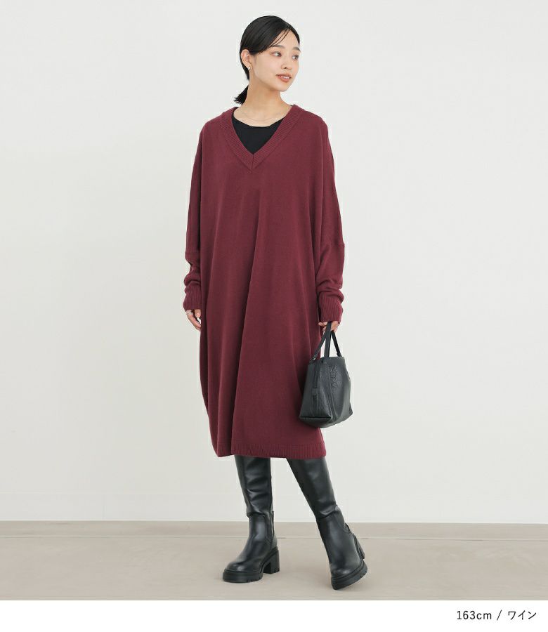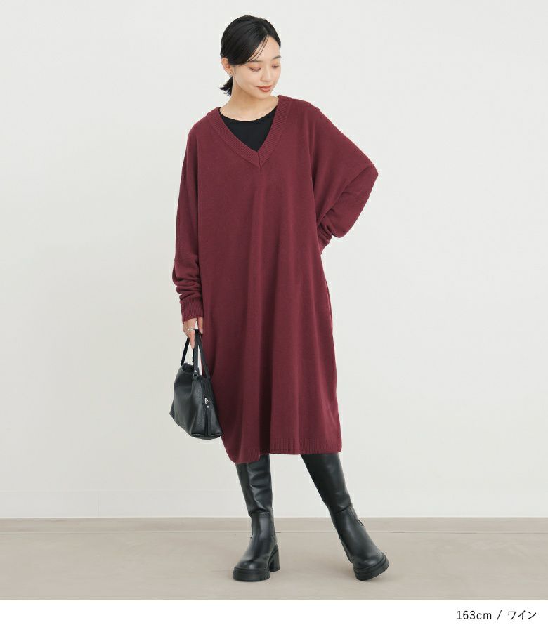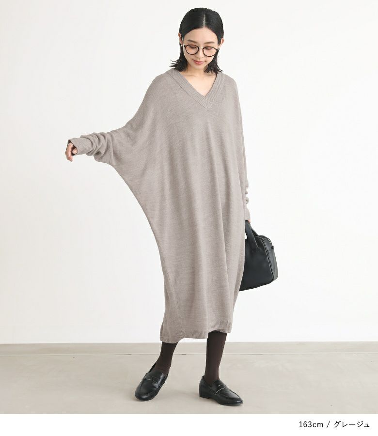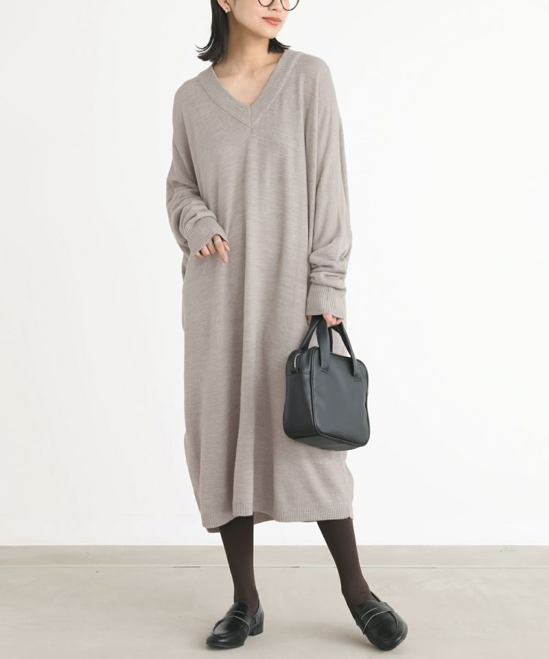 深めのVネックがデコルテを綺麗に見せ、大人っぽい印象に仕上がるニットワンピース。ゆるっとラフに着用でき、ニュアンスあるシルエットでお洒落見えする一枚。