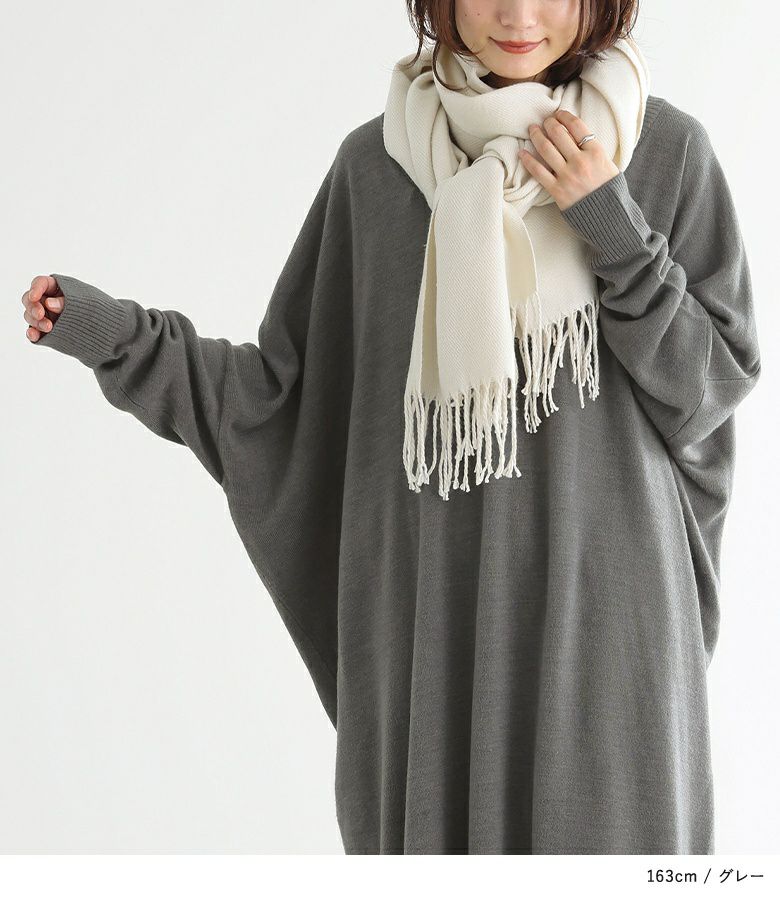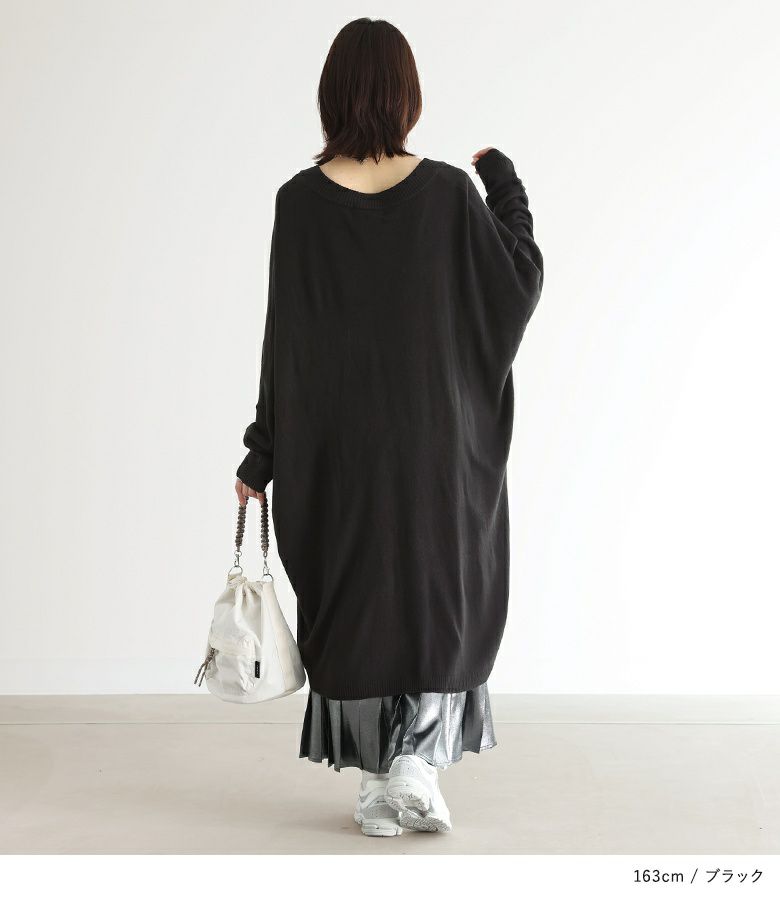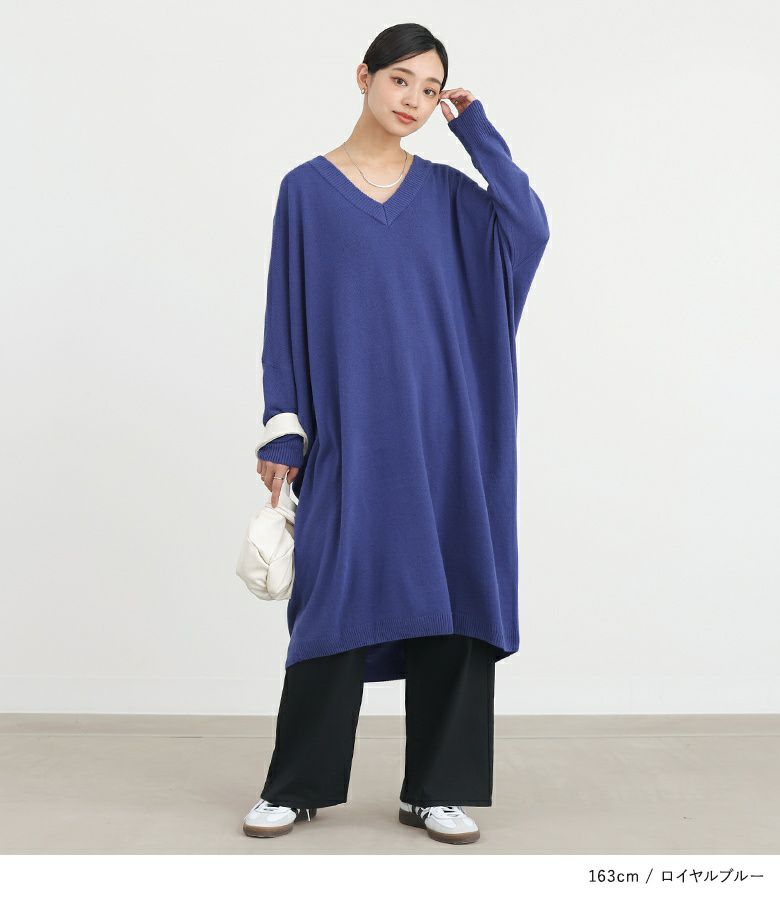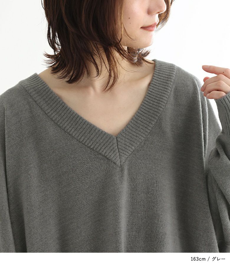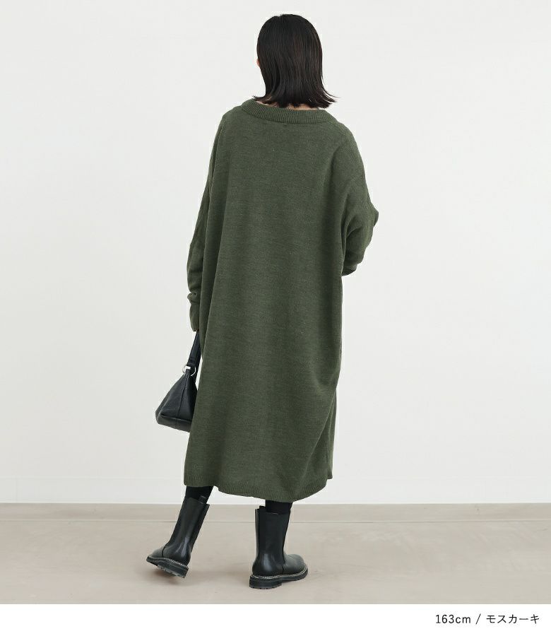 深めのVネックがデコルテを綺麗に見せ、大人っぽい印象に仕上がるニットワンピース。ゆるっとラフに着用でき、ニュアンスあるシルエットでお洒落見えする一枚。