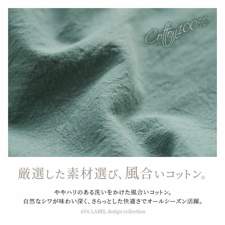 自然なシワが味わい深くて風合いのあるコットン100%素材を使用。