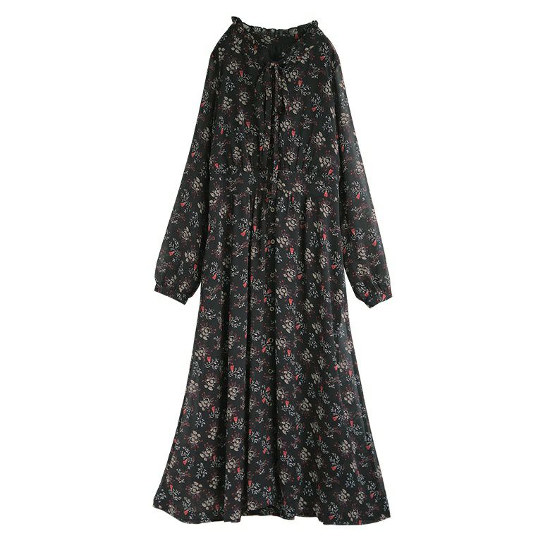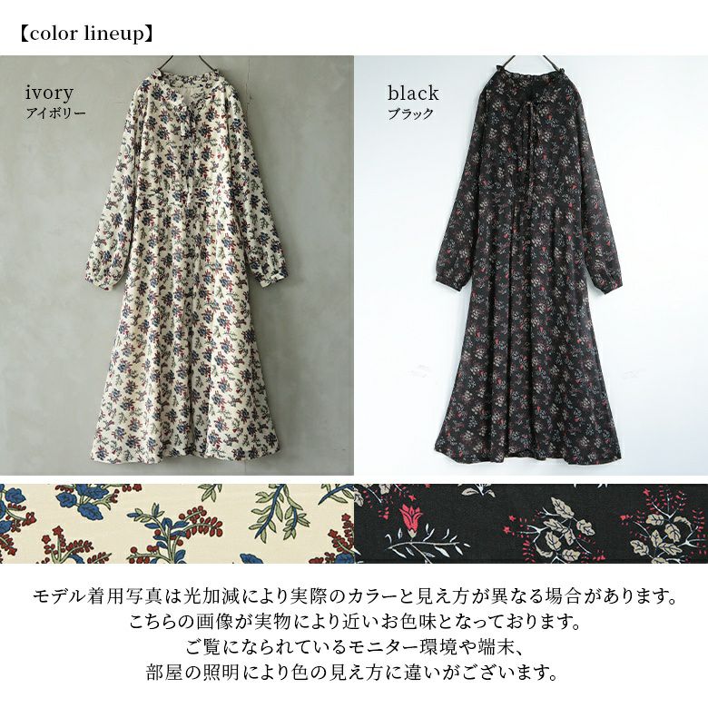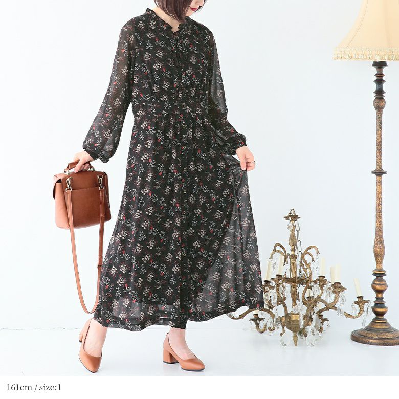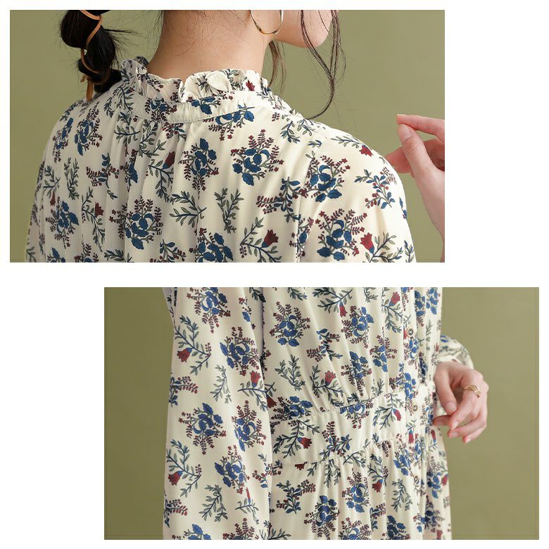 散りばめられた花柄と、フリル×スタンド襟が顔周りを華やかに魅せる。こなれ感あるリボンタイはお好みの結び方にもアレンジできる。うっすらとシースルーになっているぽわん袖は可憐で上品な印象を演出します。
