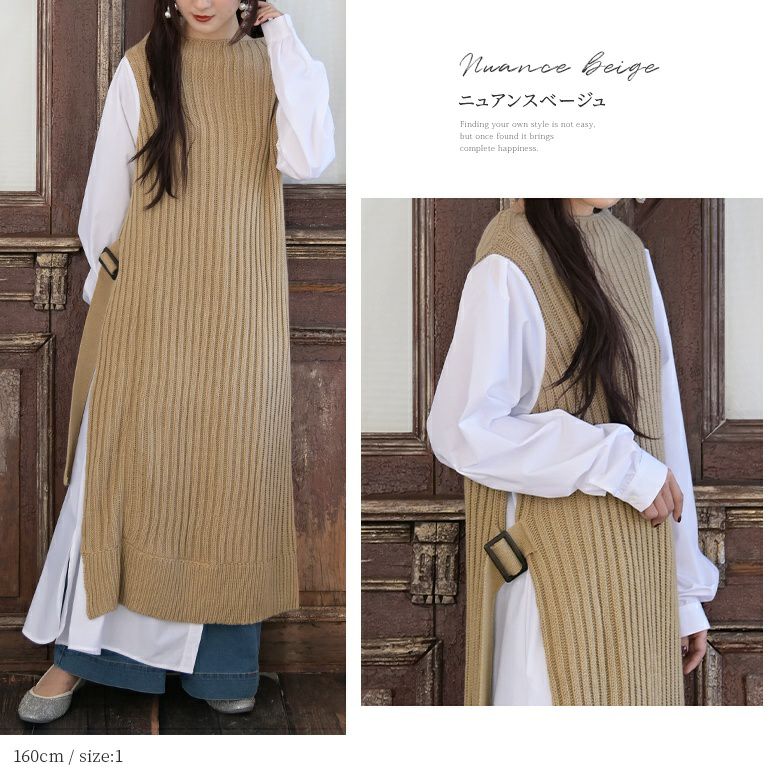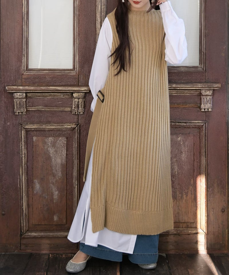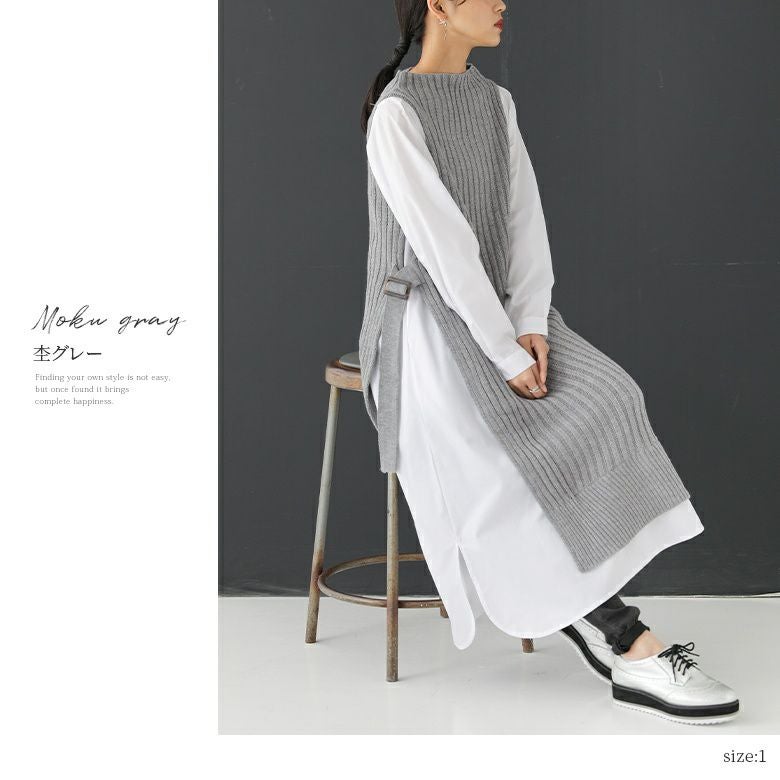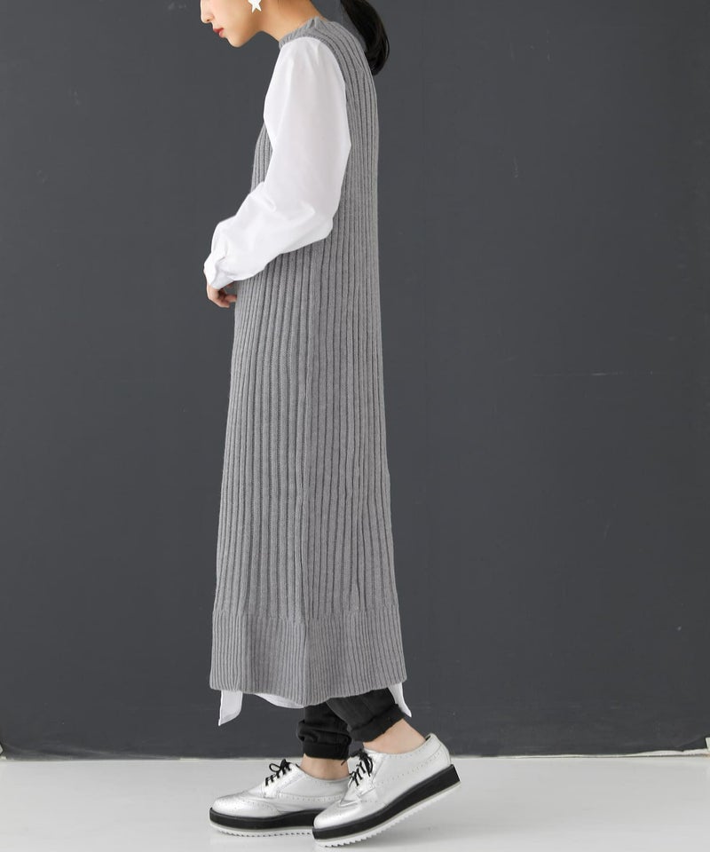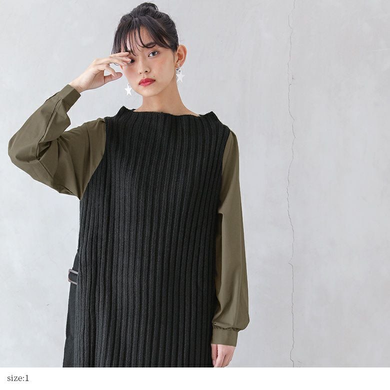 ニット×シャツ生地のセンス高まる異素材使いがお洒落感度を高める。リブ編みニットの縦長ラインでスタイル効果も抜群です。