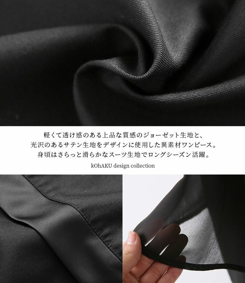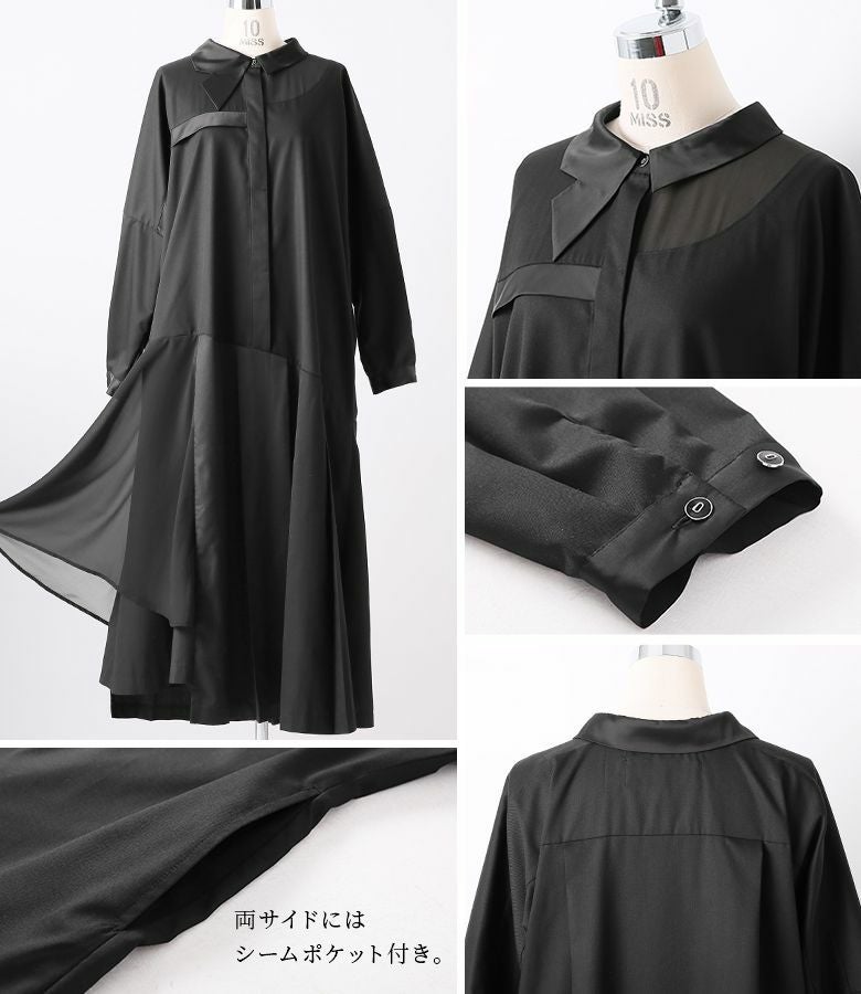 上質なサテン生地で仕立てたワンピースに、ドルマンシルエットでゆるっとこなれ感もプラス。変形デザインがお洒落な襟元は、左デコルテ部分にシアーなジョーゼット生地を使用した異素材仕立てです。