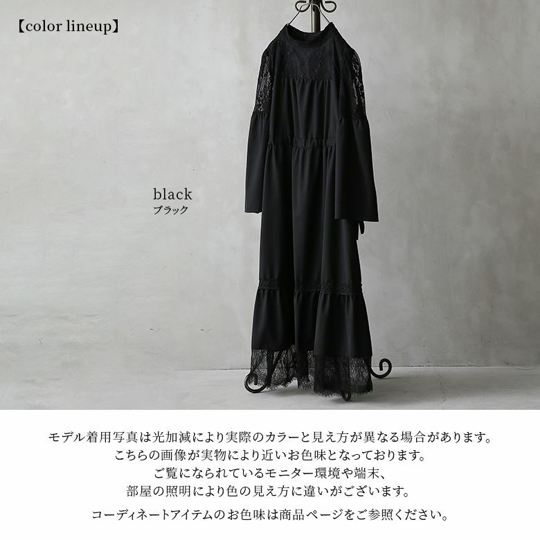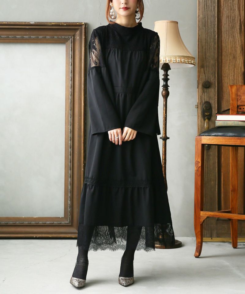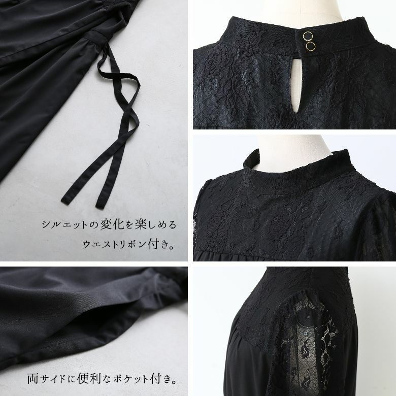 さらっと軽く着心地の良い布帛生地を、数種類の高級感溢れるレースで切り替えた贅沢な異素材ワンピース。