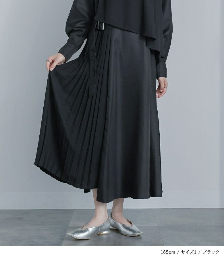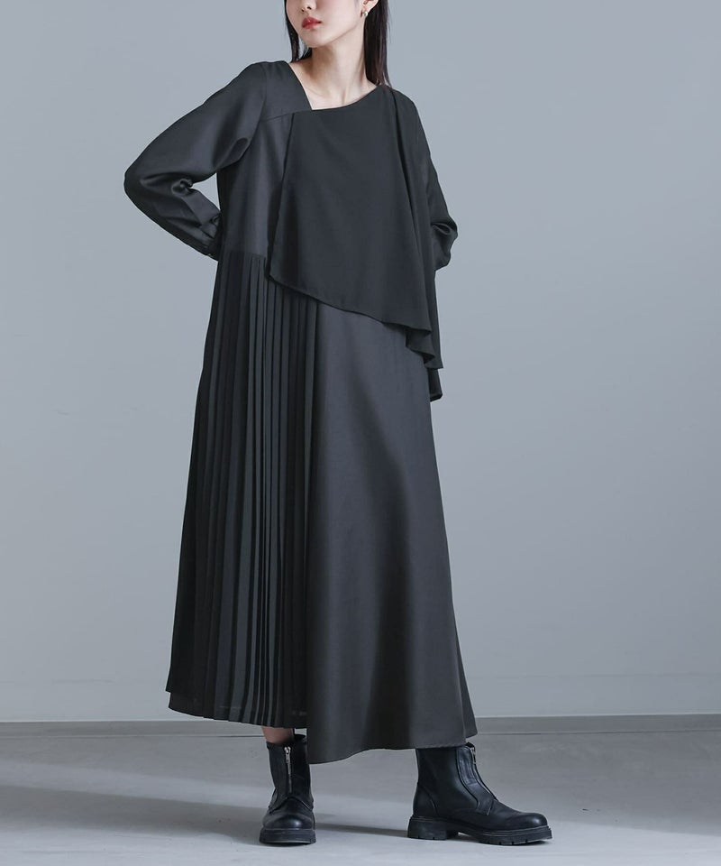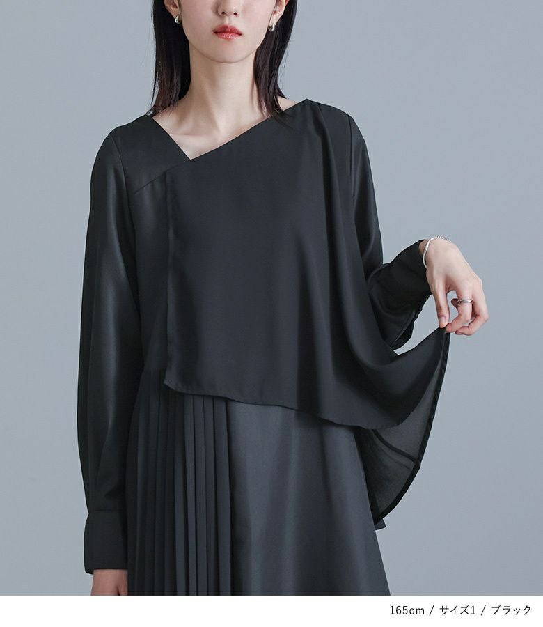 プリーツ部分と重ねられたシフォンのふわっと揺れるシルエットが魅力。綺麗なアシメラインで周りと差のつくデザインを実現しました。