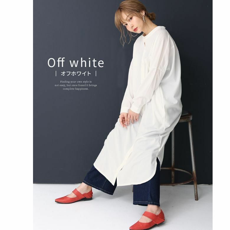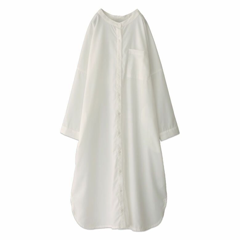 大人な抜け感を惹き出すバンドカラーデザイン。大きめ胸ポケットとスリット入りのラウンドヘムがこなれ感漂う秘密!