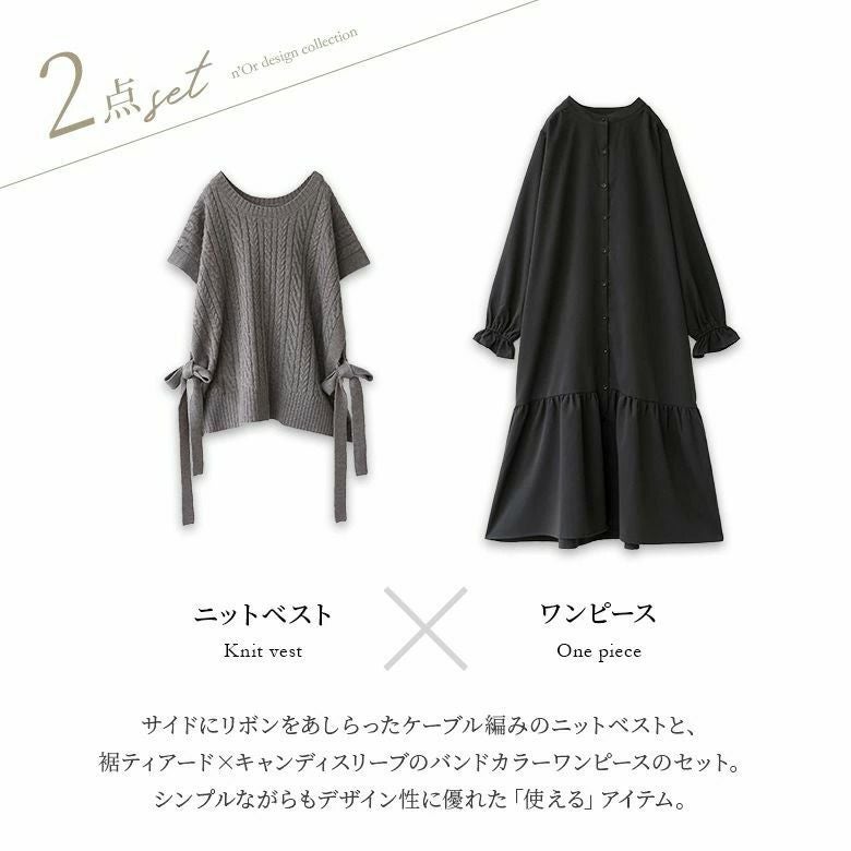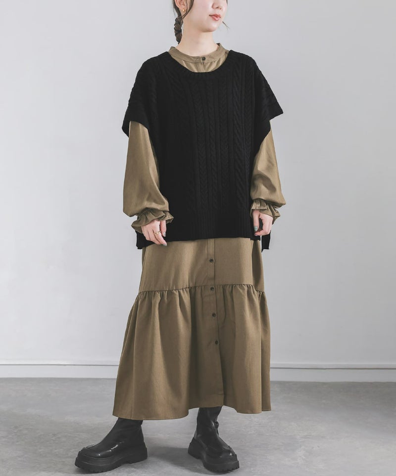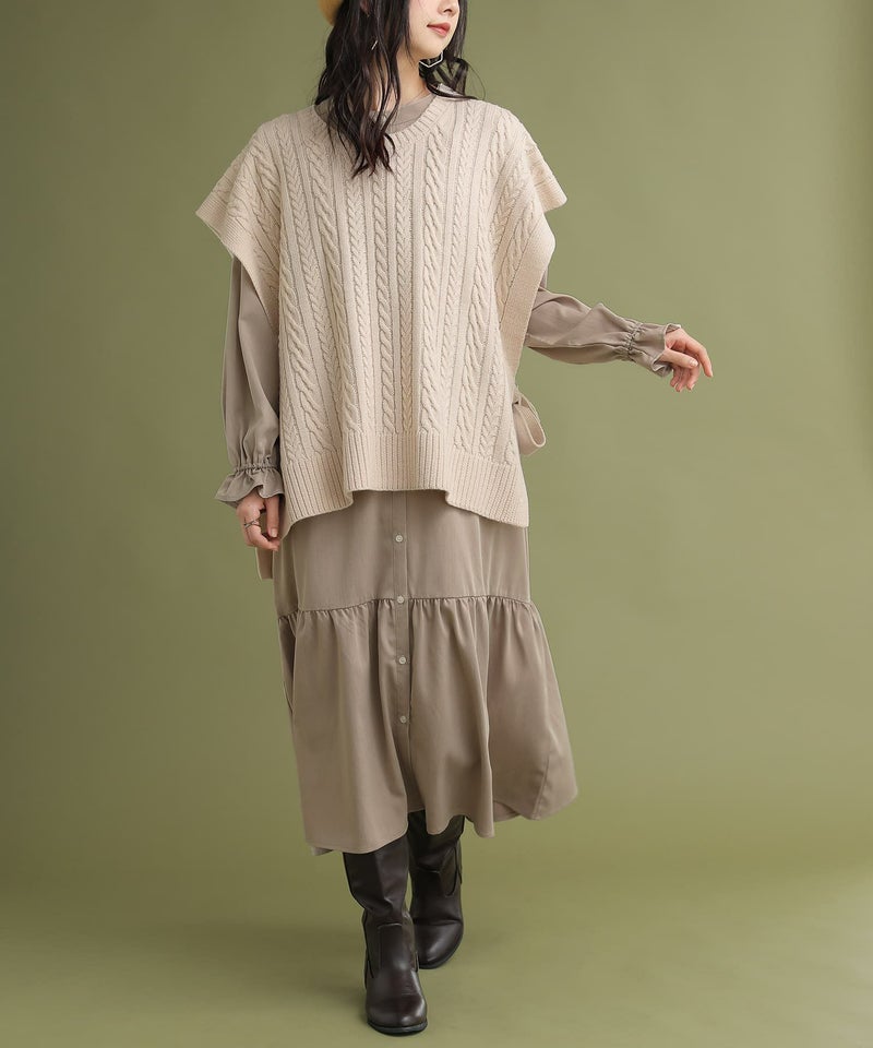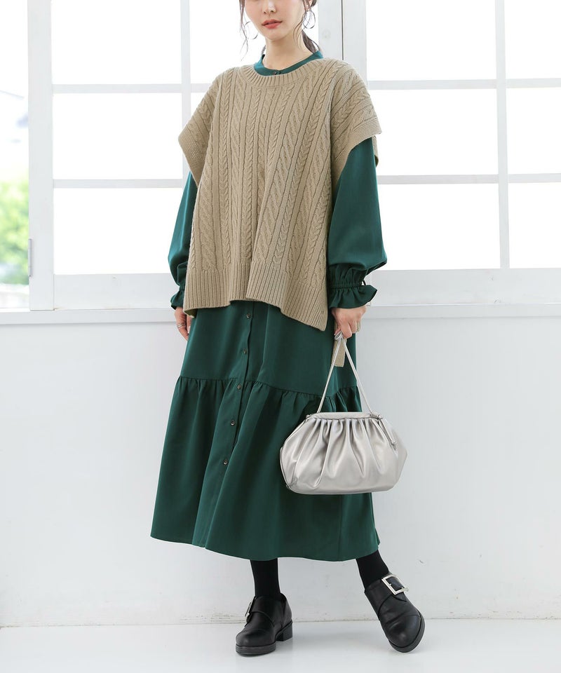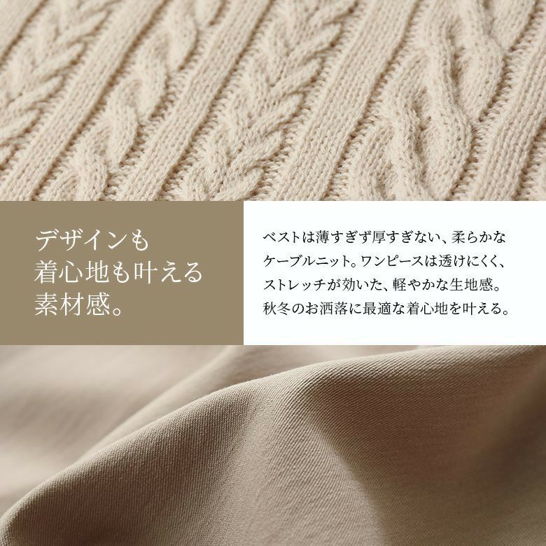 ベストは程よい厚みの柔らかなケーブルニット。ワンピースは透けにくく、ストレッチの効いた軽やかな生地感。デザインだけでなく着心地まで叶えてくれます。