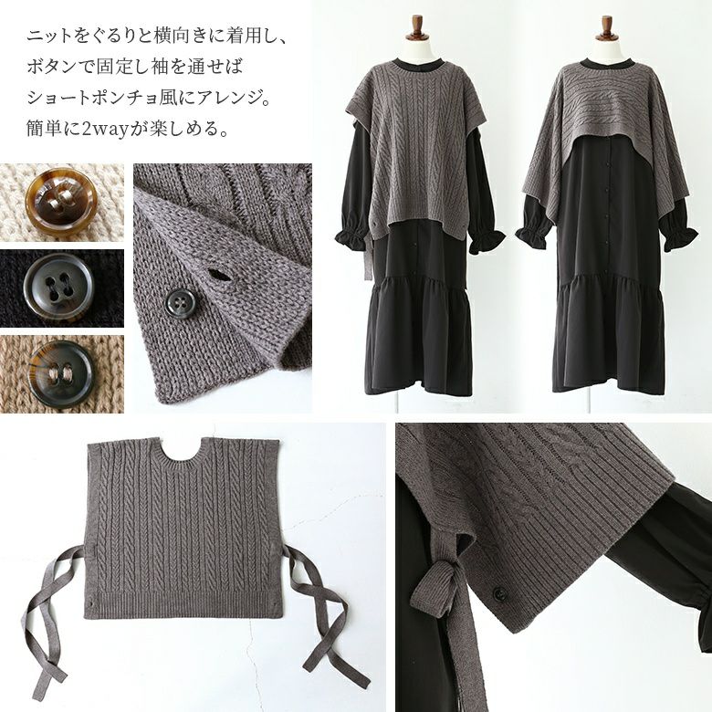 ベストはぐるりと向きを変えて着用すればショートポンチョ風にアレンジ可能!それぞれ単品で着ても、セットで着ても、インにお手持ちのボトムスを合わせても大人可愛く決まる優秀アイテムです。