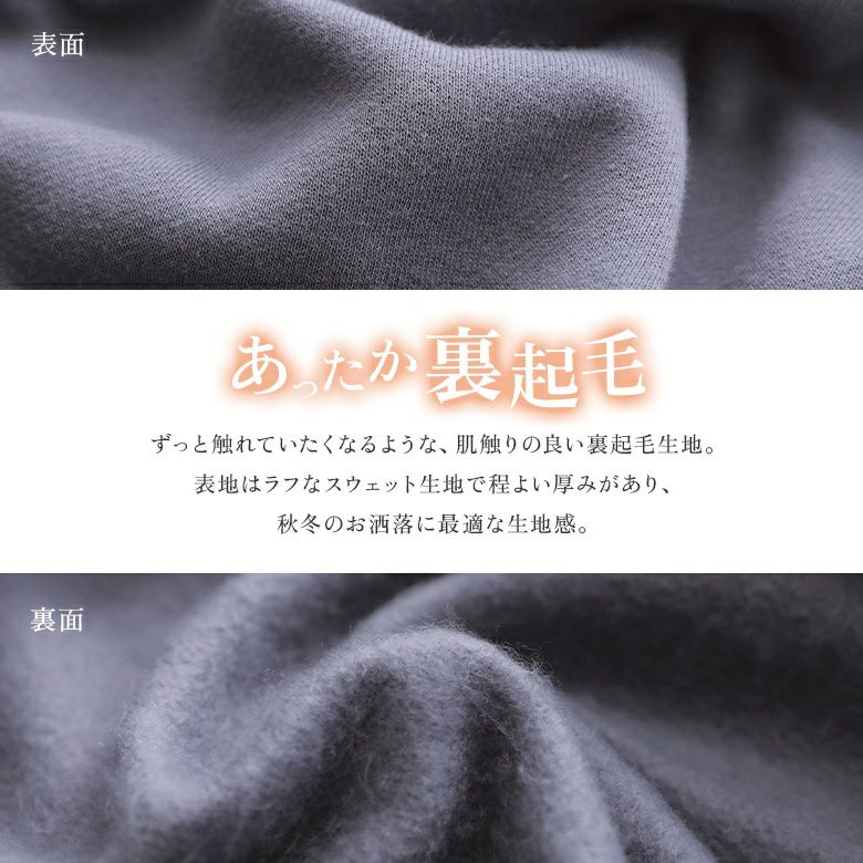 肌馴染みの良い裏起毛素材は、程よい厚みで着心地も軽く、体を暖かく包み込みます。
