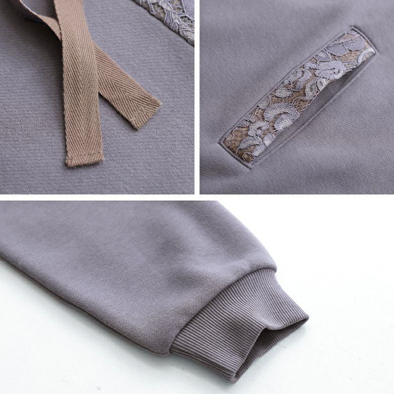 肩周りからフードの内側、ポケットまで施された繊細レースでカジュアル過ぎない着こなしが実現。裾リブでメリハリをつけたコクーンシルエットが程よい可愛さをプラス♪