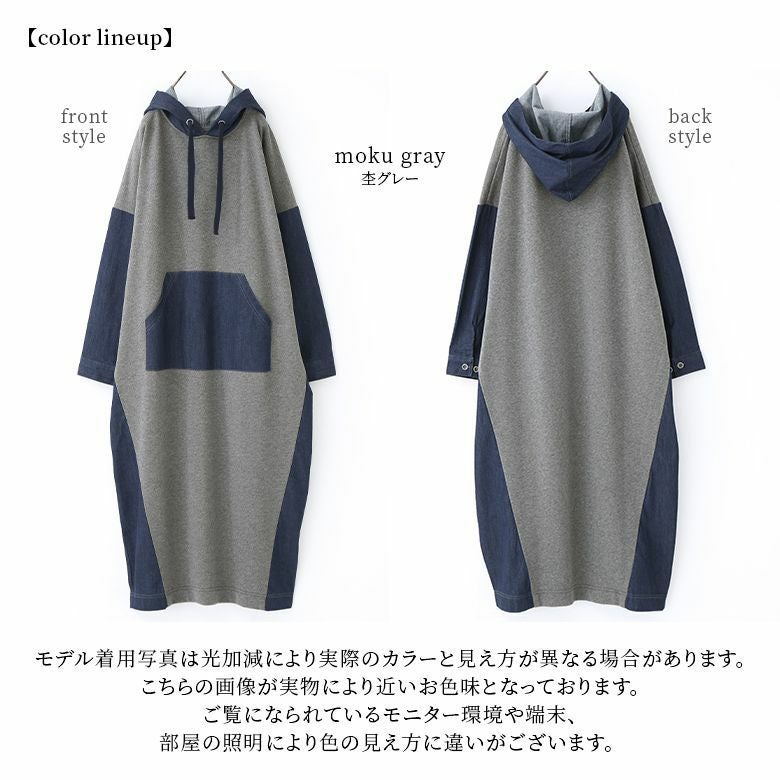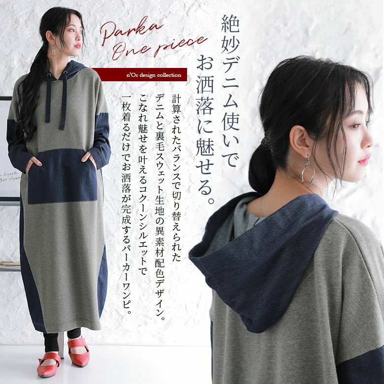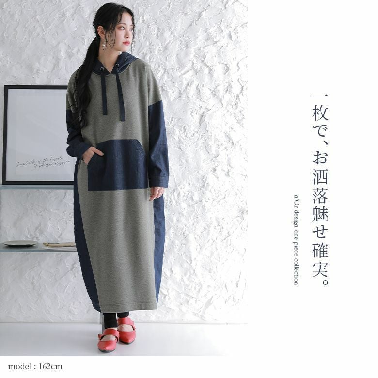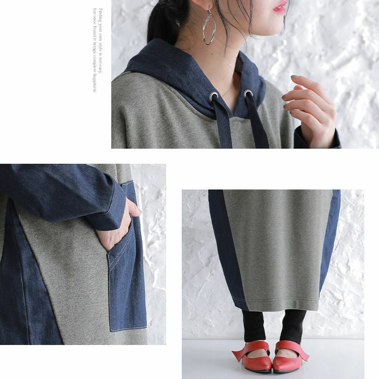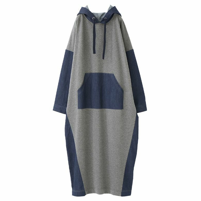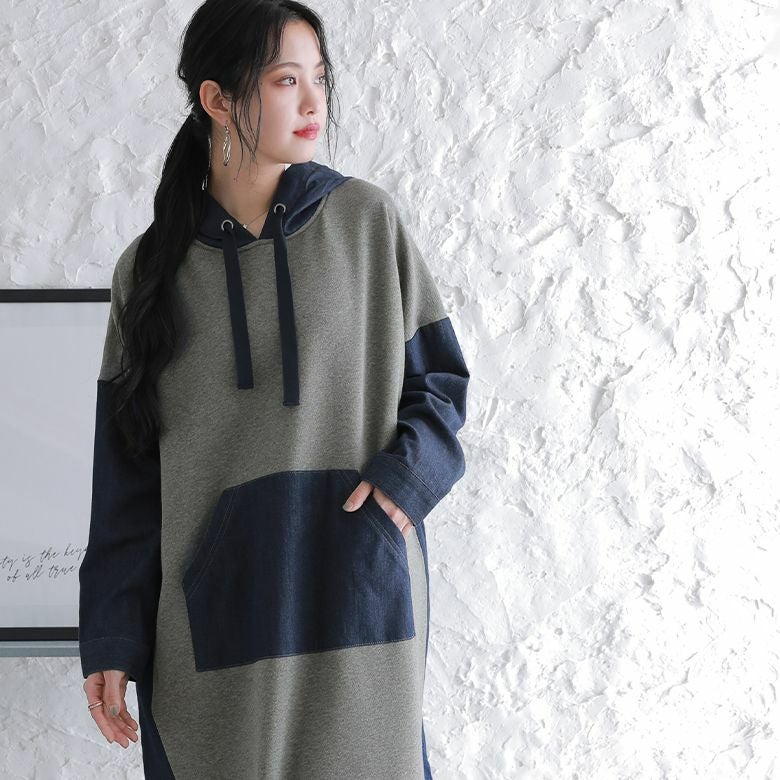 スウェット×デニムの異素材配色にデザインしたパーカーワンピースです。