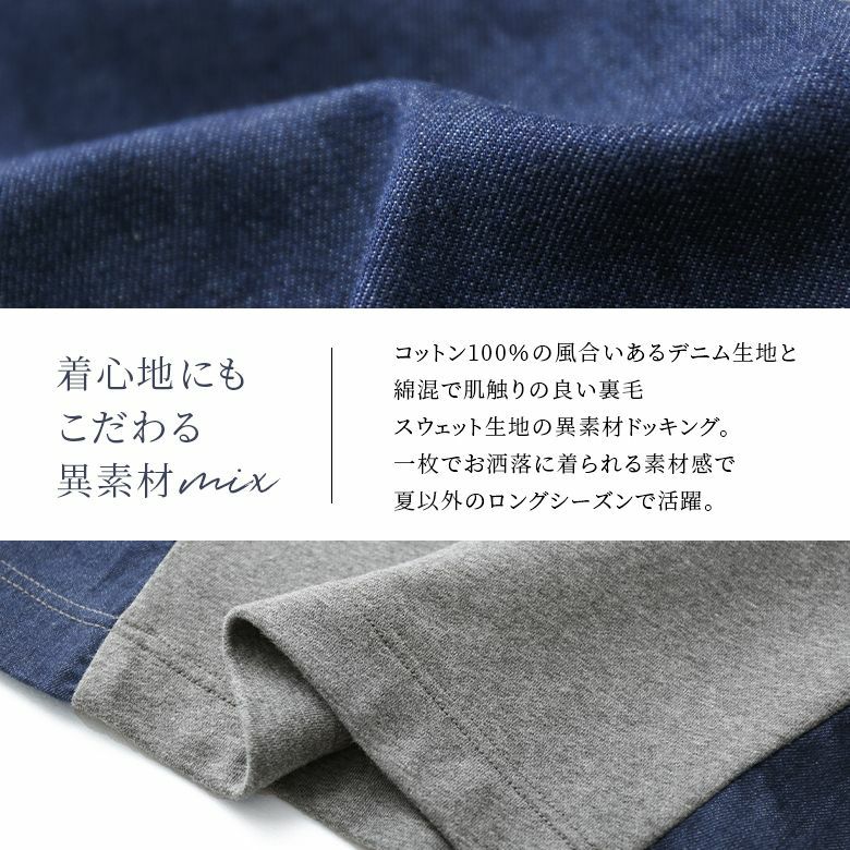 コットン混で肌触りの良い裏毛生地に、コットン100%の風合いあるデニム生地をドッキング。ロングシーズ着用いただける素材感です。