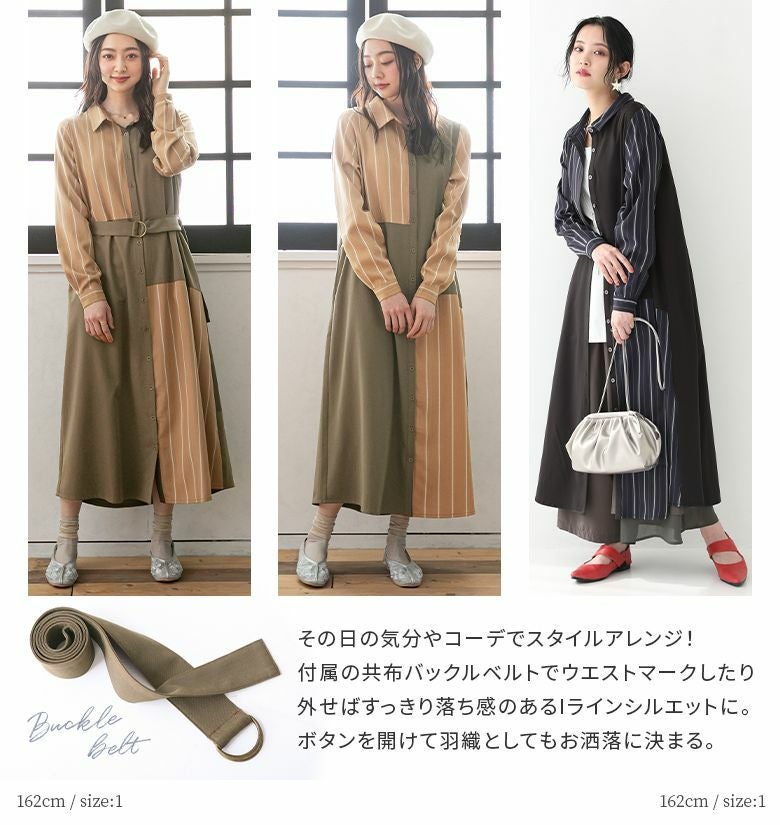また、付属のバックルベルトでウエストマークしてスタイルアレンジもできる♪外せばすっきり落ち感のあるIラインシルエットにしたり、羽織りとしても使えたりして着回しも広がります。