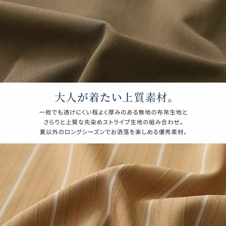 程よく厚みのある無地の布帛生地と上質な先染めストライプ生地を使用。これからの季節はもちろん、ロングシーズン着られる優秀素材です。
