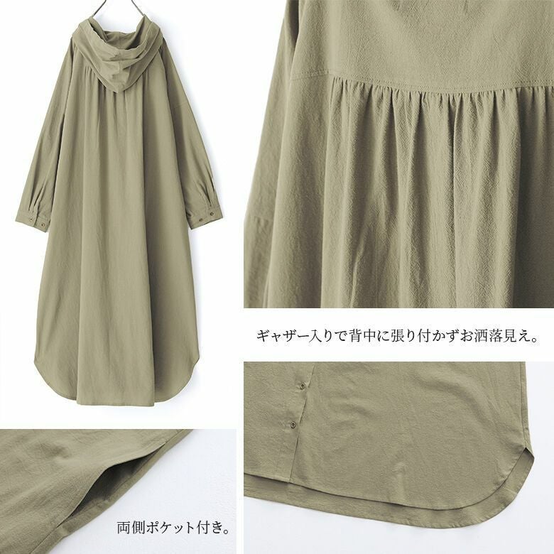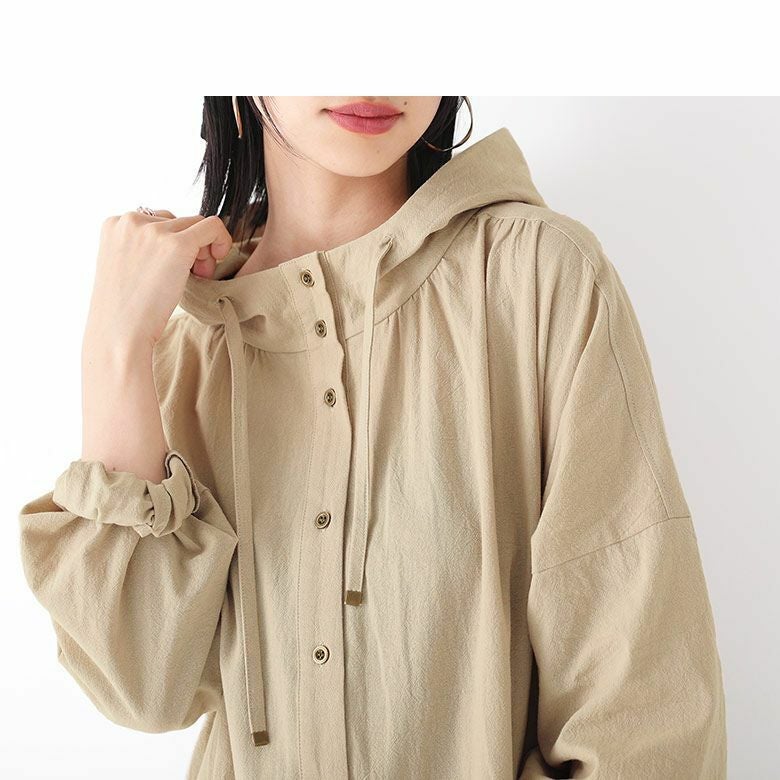 ニュアンス溢れる風合いのフード付きシャツワンピ。