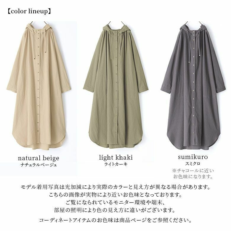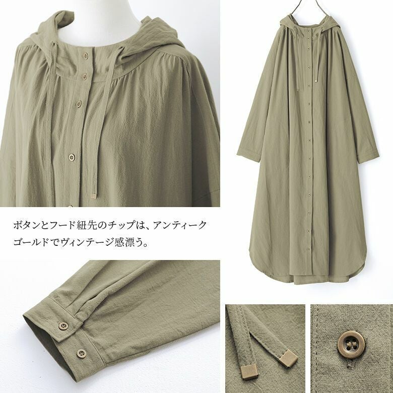 ワンピースとしてはもちろん、羽織りとしても使えて着回しの幅が広がる優秀アイテム♪ボタンとフード紐先のチップは、アンティークゴールドにすることでヴィンテージ感漂う雰囲気に仕立てました。
