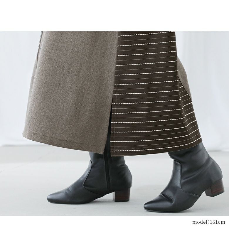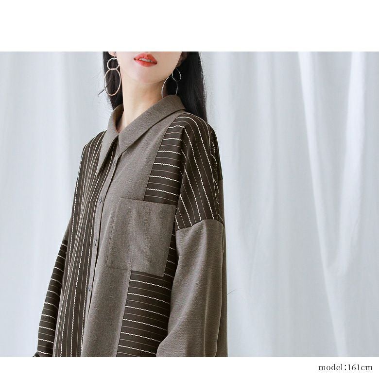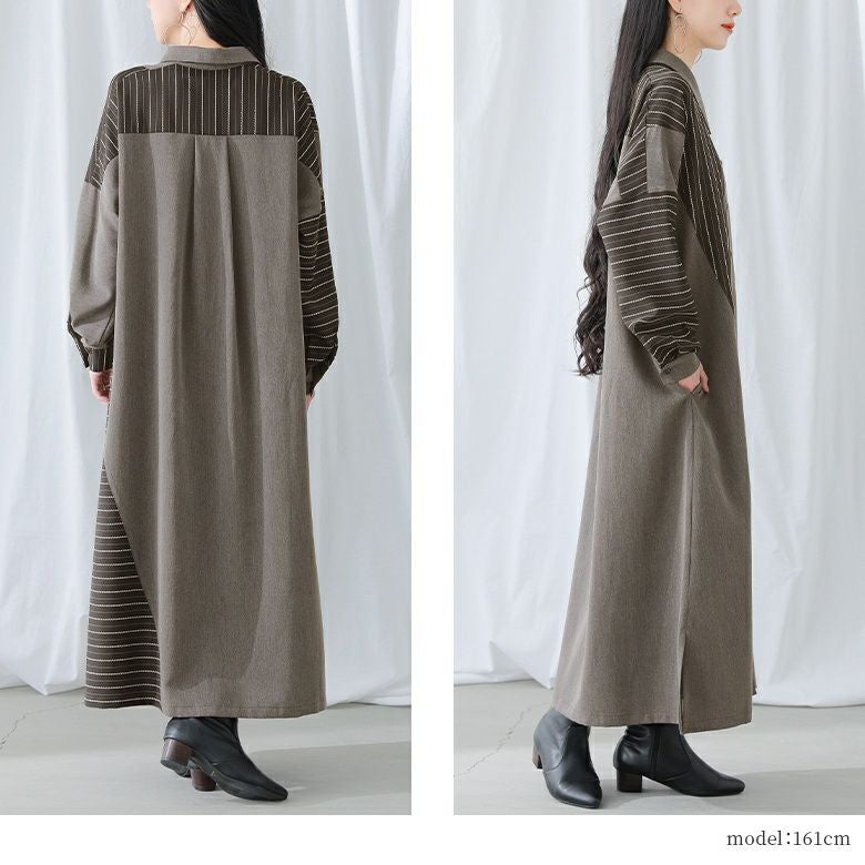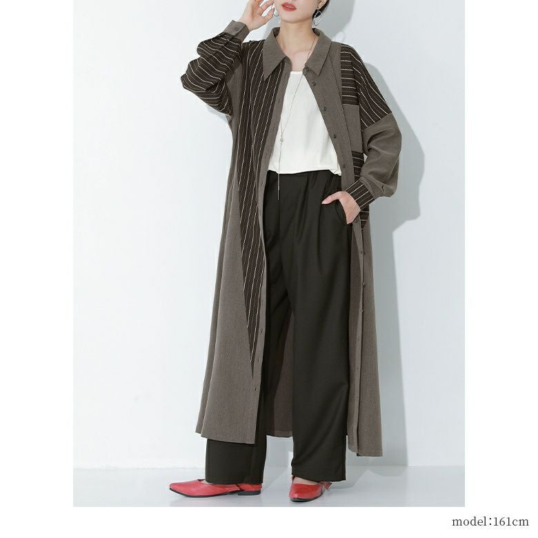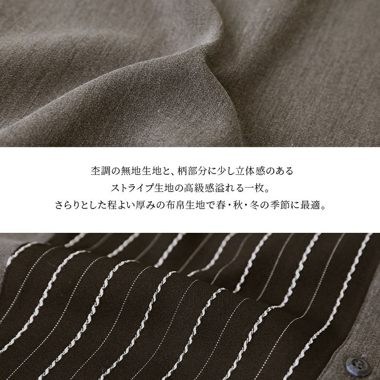杢調の無地生地×立体感のあるストライプ生地を組み合わせた高級感ある一着。さらりとした程よい厚みの布帛生地でロングシーズン着用いただけます。