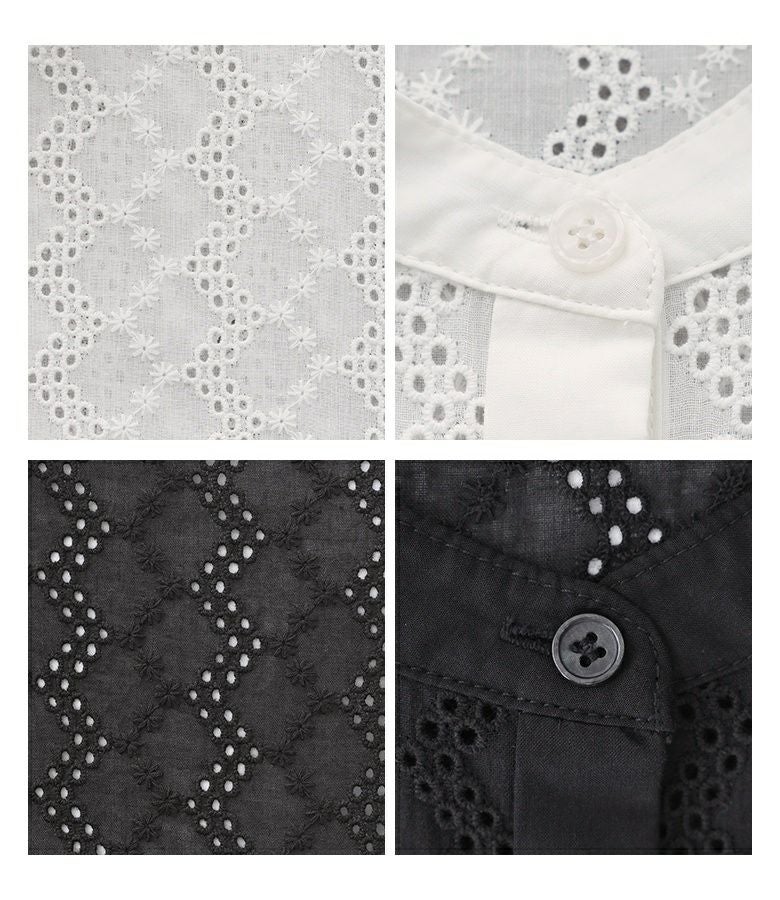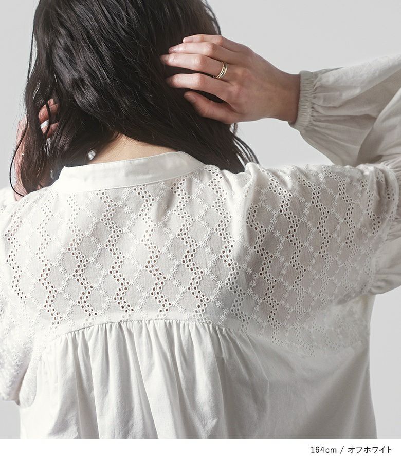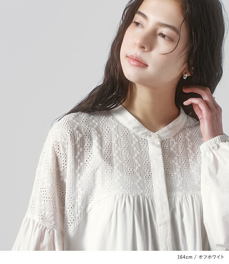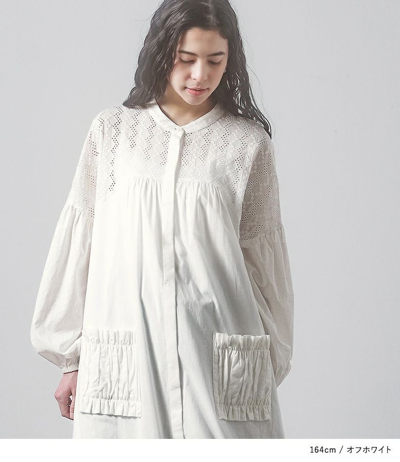 コットン100%の優しい風合いの生地で、軽やかな着心地です。コットンレース部分は可愛くなり過ぎない大人っぽい柄で、程良い透け感があります。身頃からスカート部分にはさっぱりとした肌触りの裏地付きです。
