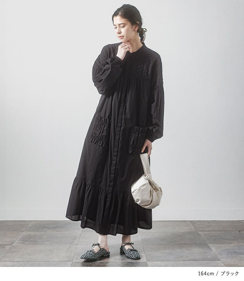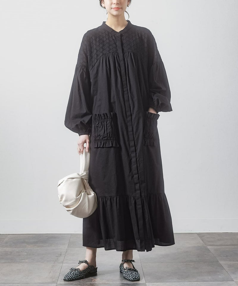 ヨーク部分をコットンレースで切り替えた、異素材ティアードワンピース。裾のティアードやフリルのパッチポケット、ギャザーでやや甘さも取り入れつつ、Aラインのフレアシルエットで大人っぽく着用できるアイテムです。ヨーク切り替えはカーブにしてポイントになるようにしました。