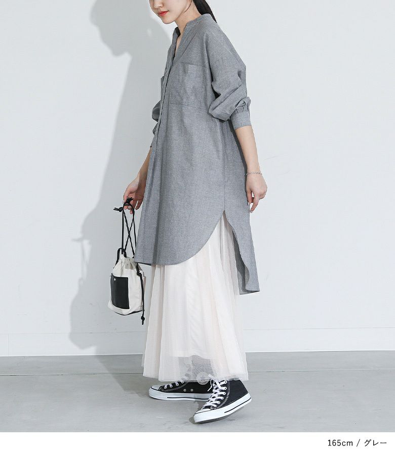 ゆるっとしたワンピースなので細身のパンツとスニーカーを合わせた大人カジュアルや、抜け感のあるスカートと合わせてナチュラルにしてみたりと様々なアイテムと相性抜群の一枚です。