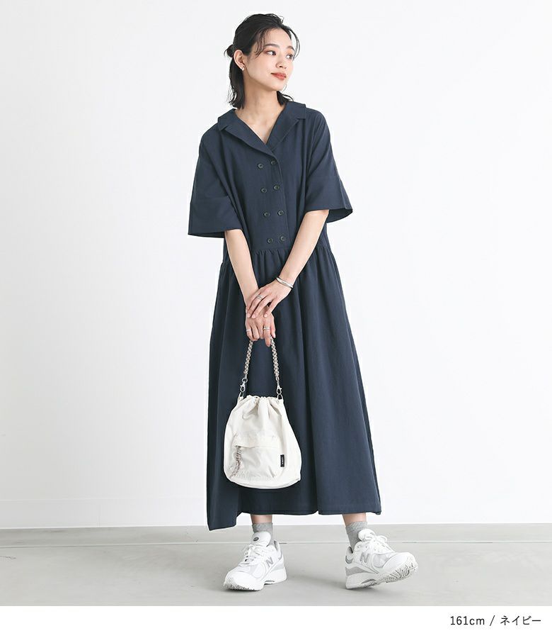 開襟デザインが涼し気なシャツワンピース。程良い開き具合で大人っぽく着用できます。ウエスト切り替えにはギャザーを入れてフレアスカートのシルエットにし、女性らしさもプラス。横に二つ並べたボタンがポイントになったデザインです。