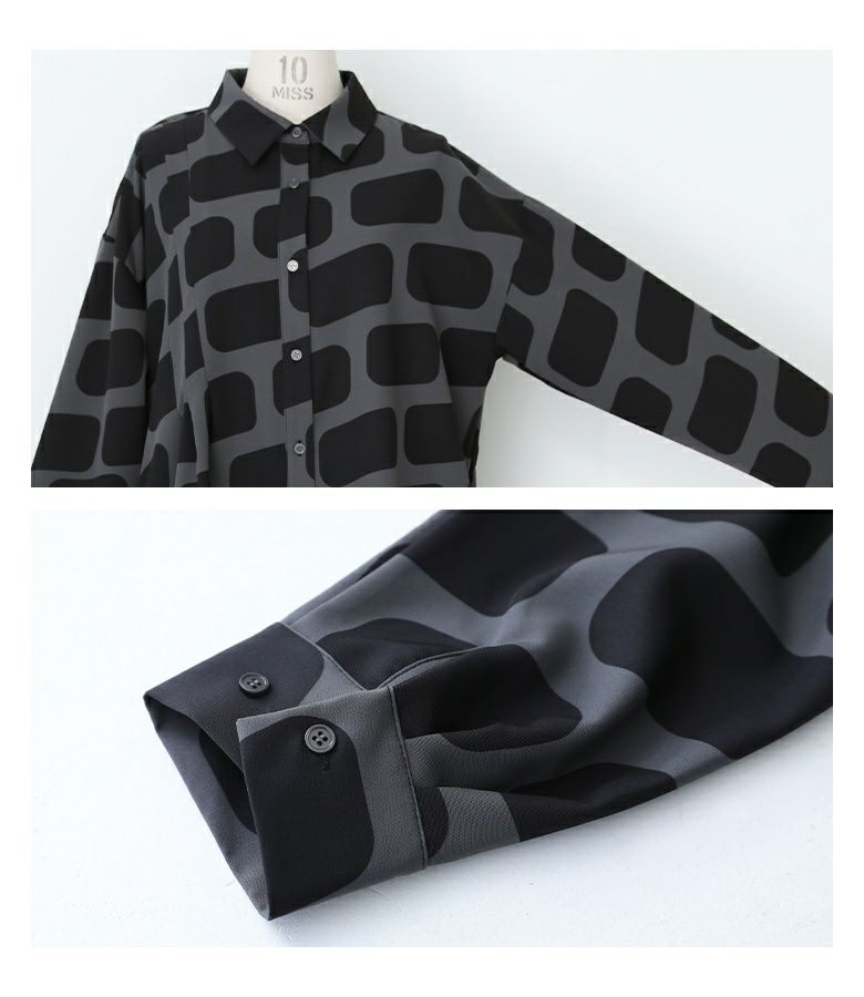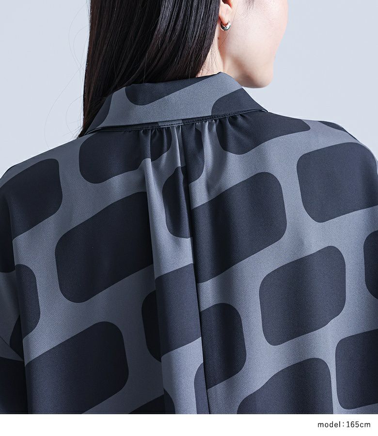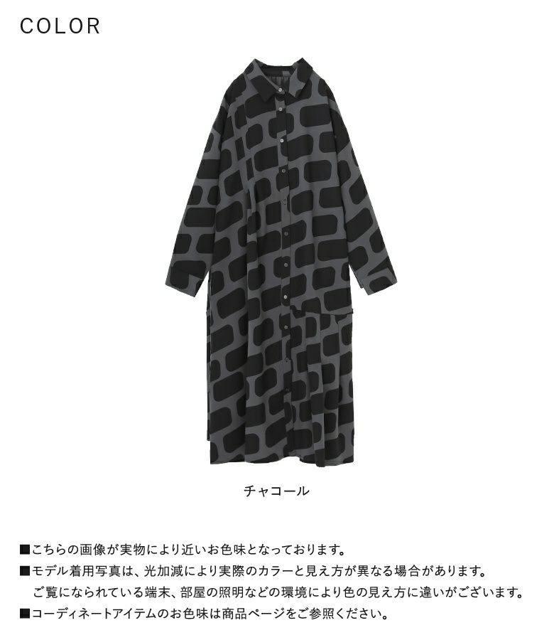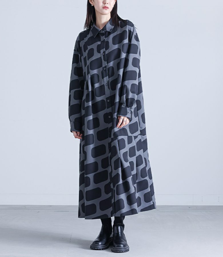 オリジナルのスクエア柄が全面にプリントされたシャツワンピース。目を惹く個性的な柄がモードな雰囲気を醸し出す一着です。左右アシンメトリーに入ったタックにより、均等にプリントされたスクエア柄に動きが出て見えるデザイン。