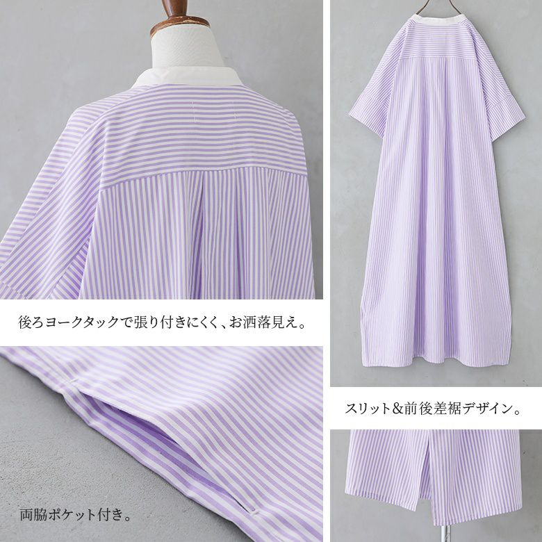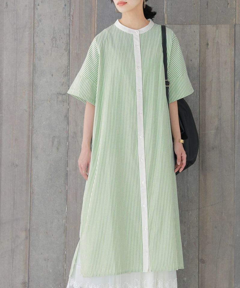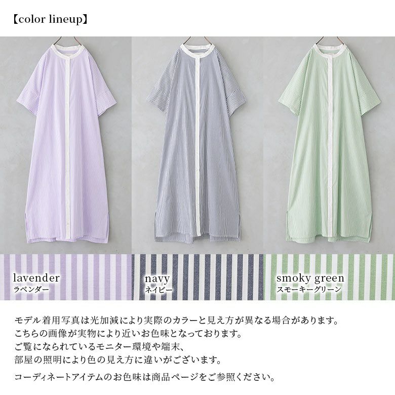 身頃のストライプ柄と、襟のクレリックデザイン&前立て部分の配色がお洒落のポイント。ゆるっと着られて、羽織にも使える大人のシャツワンピースです。