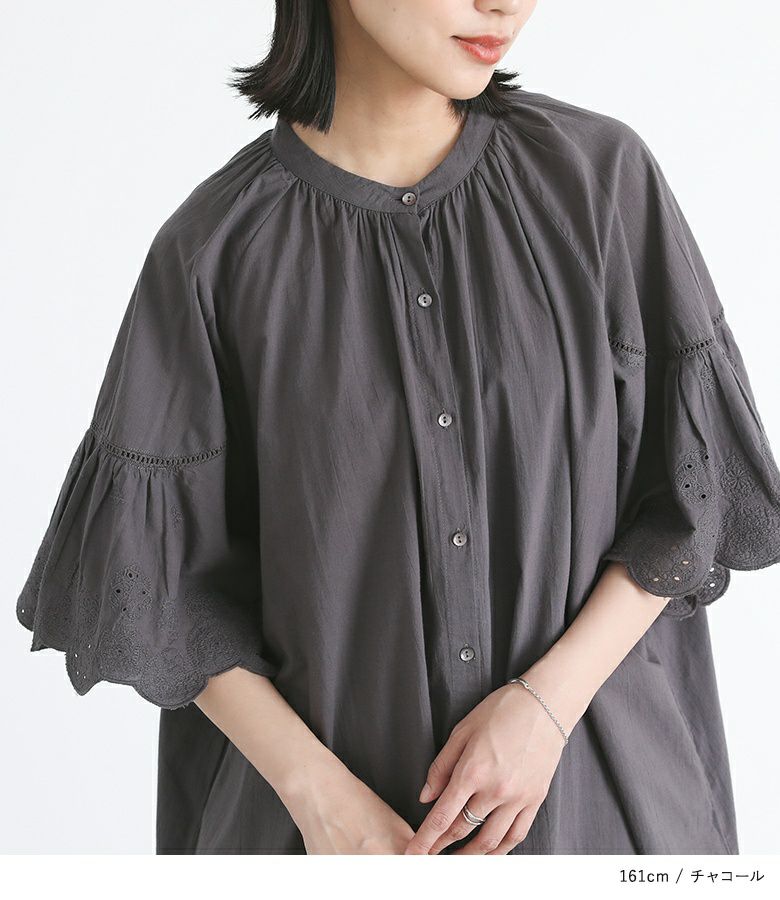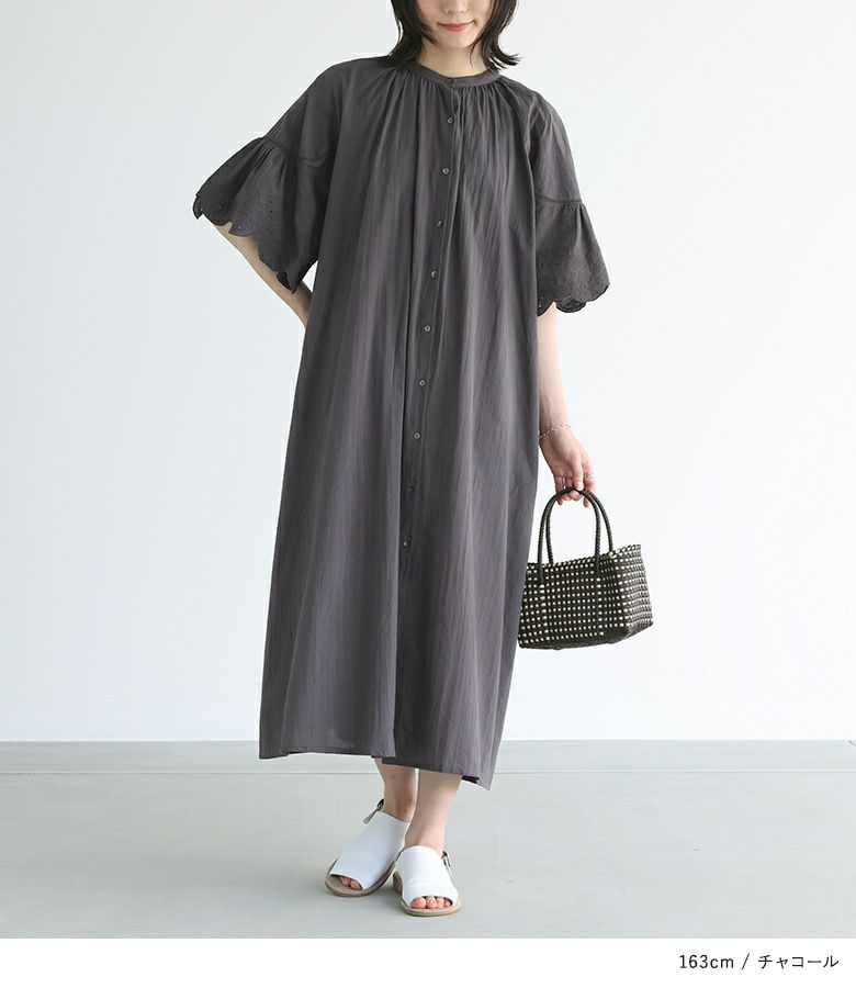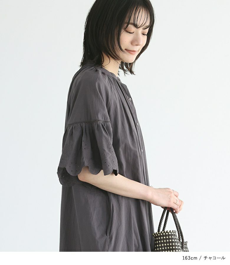 スカラップ刺繍生地と梯子レースで切り替えた袖がポイントのワンピース。ひらっとしたフレアスリーブが印象的な一枚です。ノーカラーで首元すっきり&前後襟ぐり下にはギャザーを入れ、身体に張り付かず快適にご着用いただけます。