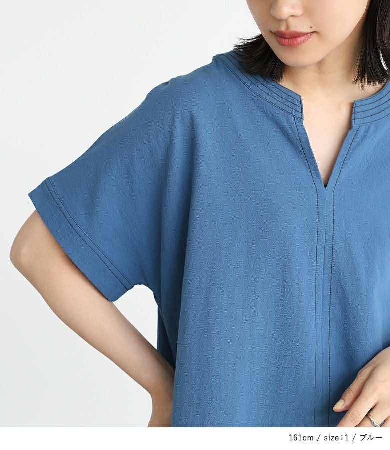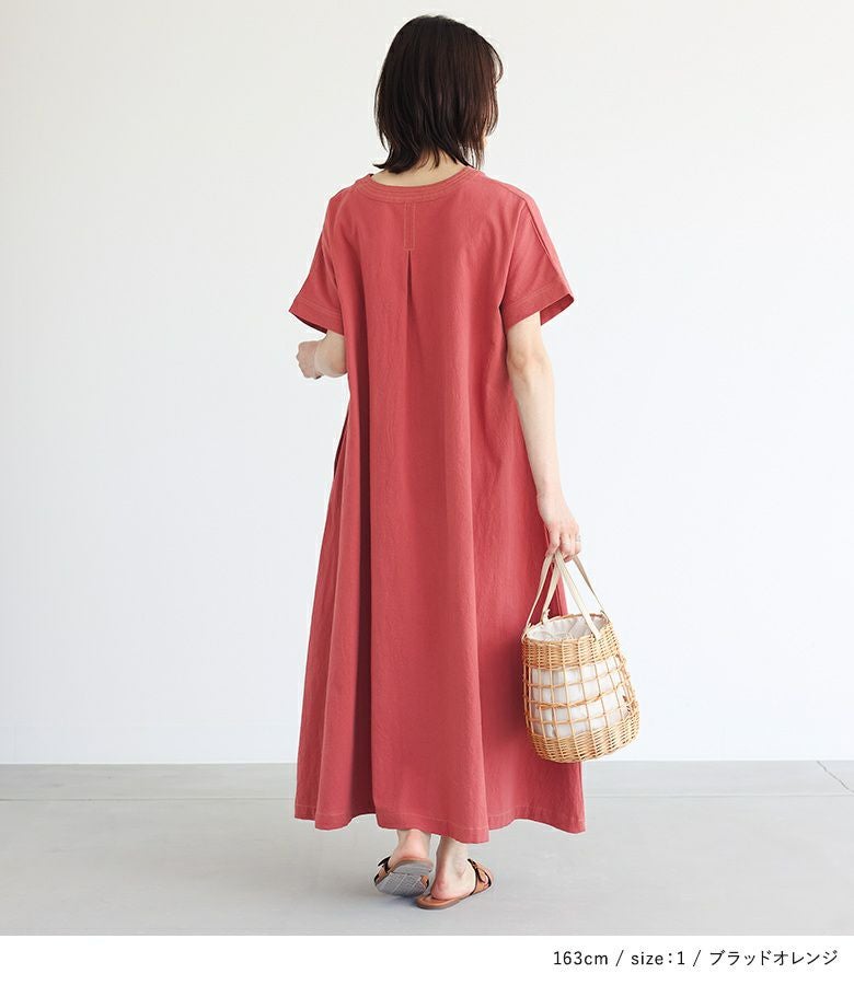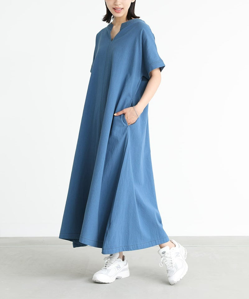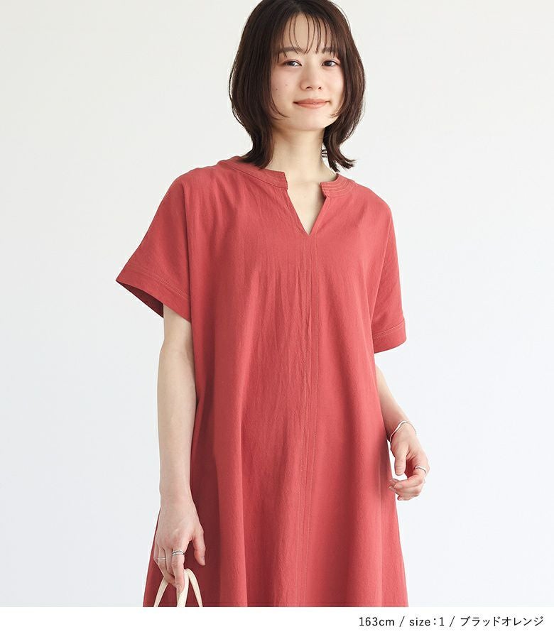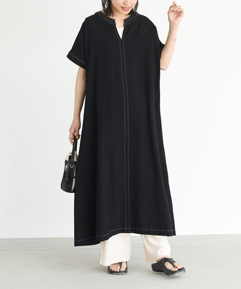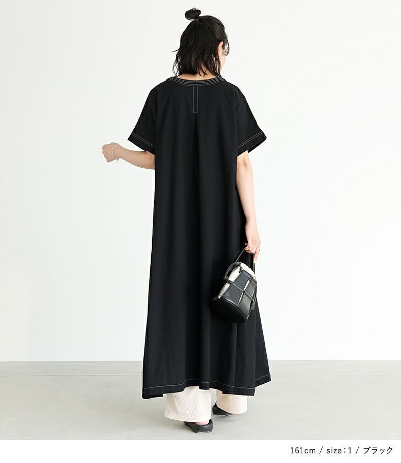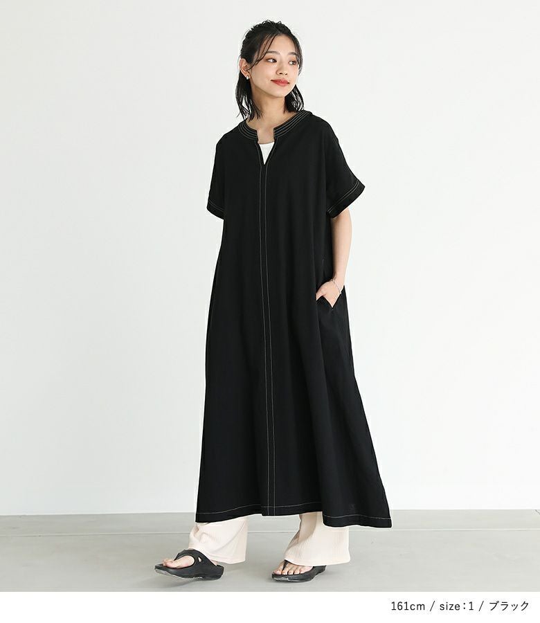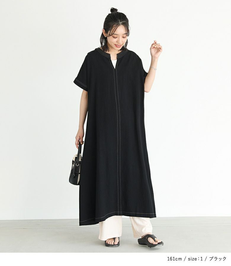 スキッパー開きのAラインフレアワンピース。ゆるっとリラックス感のあるデザインです。シンプルな中に、配色ステッチがさりげないアクセントになった一枚。首元はスキッパー開きでデコルテをすっきり綺麗に見せます。両サイドにポケット付き。