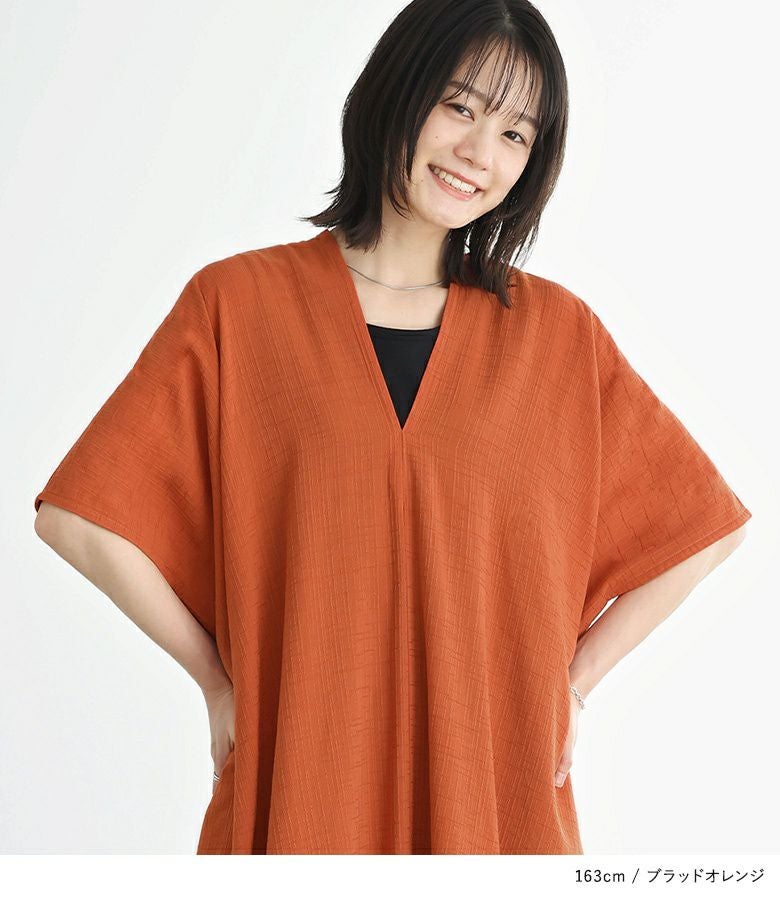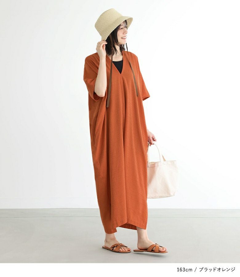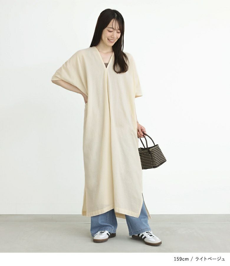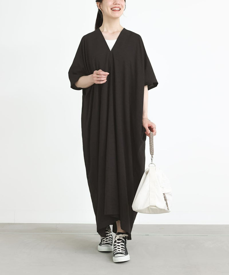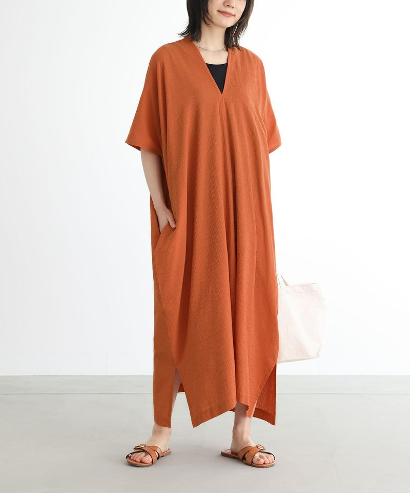 落ち感のあるシルエットと深めのVネックが女性らしさを惹き立てるカフタンワンピース。四角い形が、着用すると独特の落ち感を生み、リラックスした着心地のアイテムです。裾スリットで抜け感をプラス&便利なシームポケット付き。