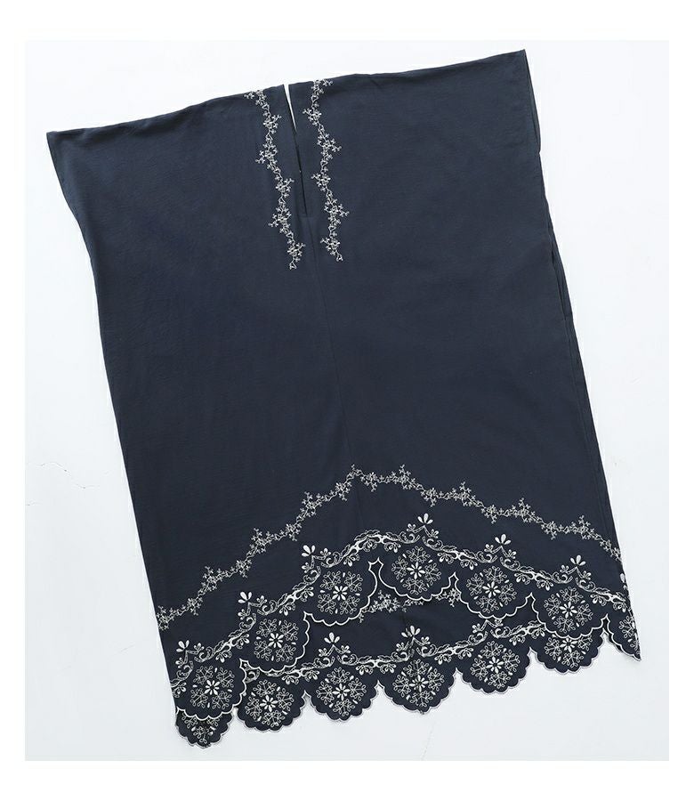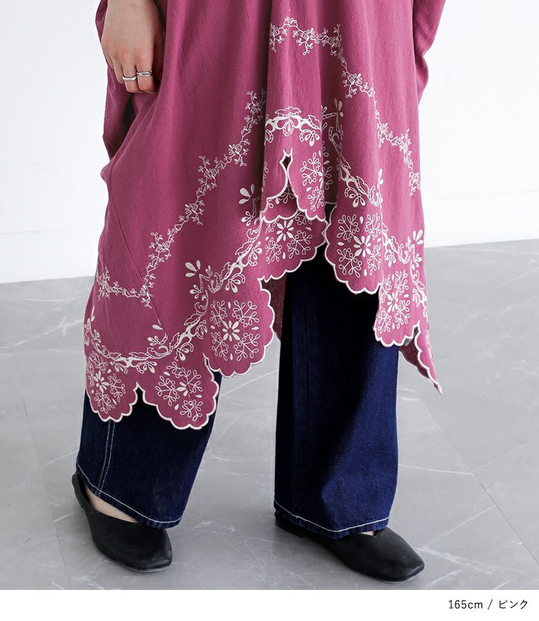 レース柄を刺繍で裾に施したカフタンワンピース。ゆるっとしたシルエットで身体のラインを拾わず体型カバーが叶います。首元をすっきりと見せてくれる襟ぐりのVラインでこなれた抜け感を演出。前上がりの裾ラインはレイヤードアイテムとも好相性で、スタイリングの幅が広がります。裾がカットワークのスカラップ仕様なので、ラフすぎず一枚でお洒落な雰囲気に仕上げてくれる一着です。