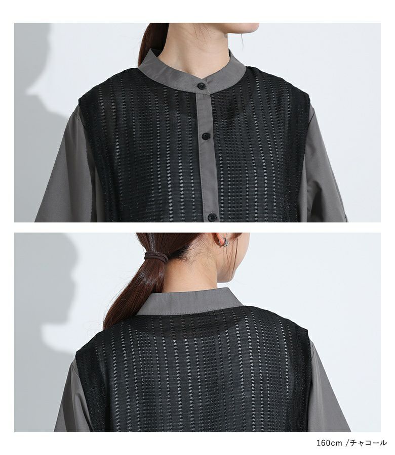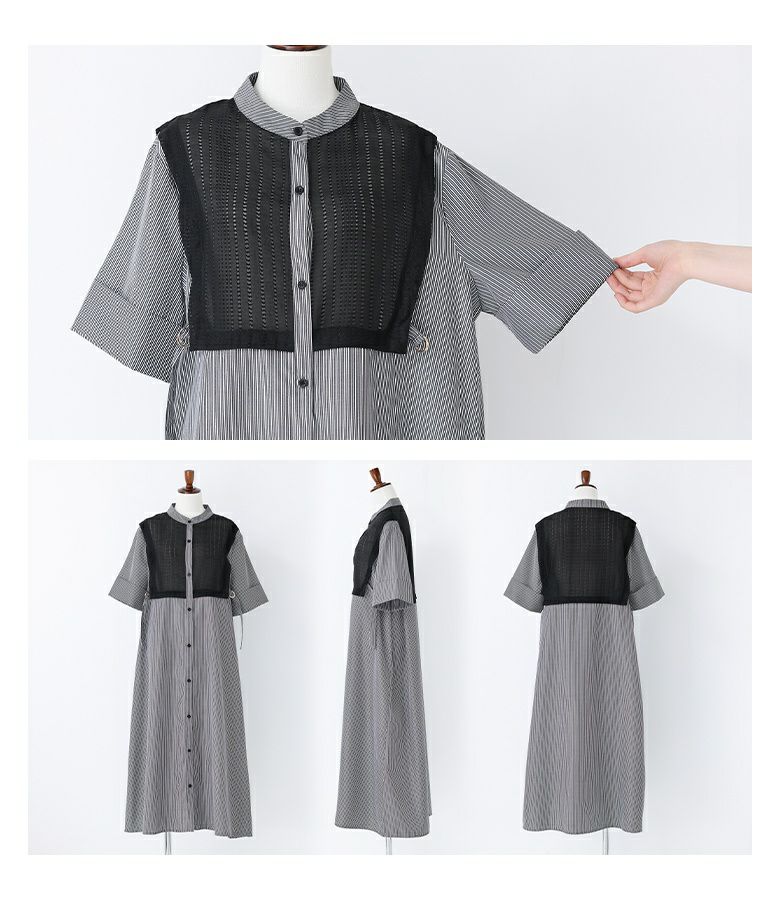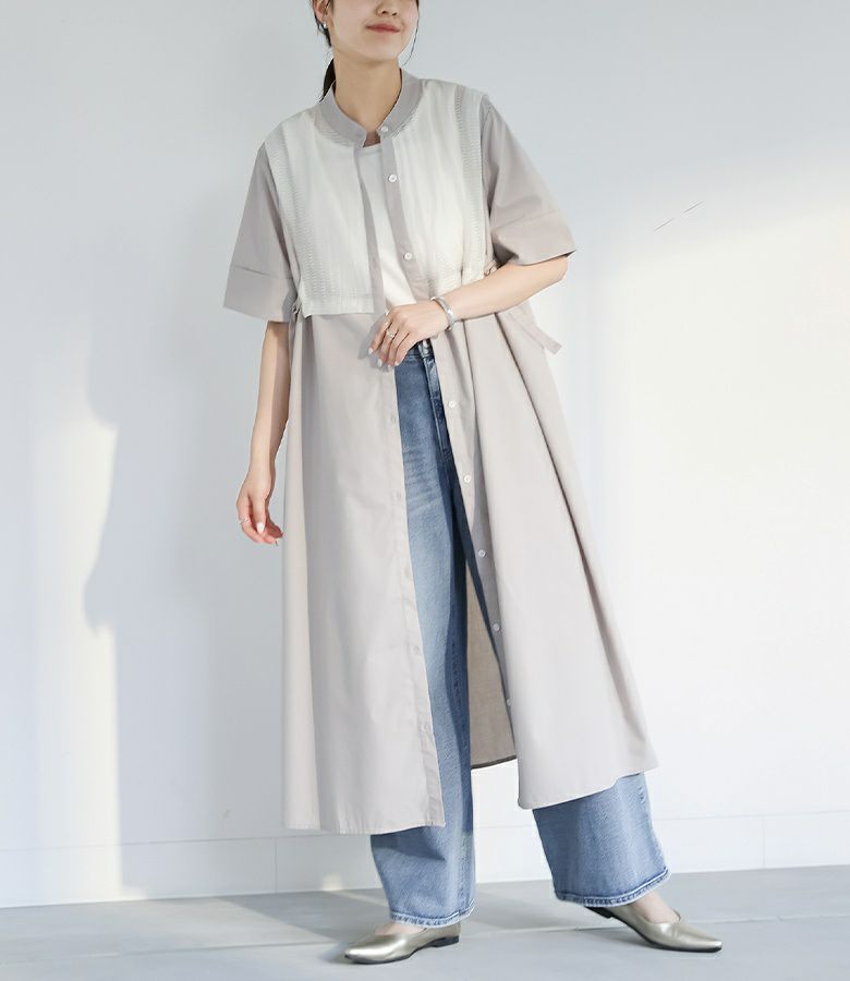 シャツ生地とジャカード生地を切り替えた異素材レイヤードワンピース。胸元から背中側にかけて透け感のあるジャカード生地をあしらうことで、他にはないお洒落な雰囲気が完成。ロールアップした袖デザインがコーディネートのポイントに。サイドには自由にシルエット調整が可能なベルトが付いており、その日の気分に合わせてお好みの着こなしを楽しめます。