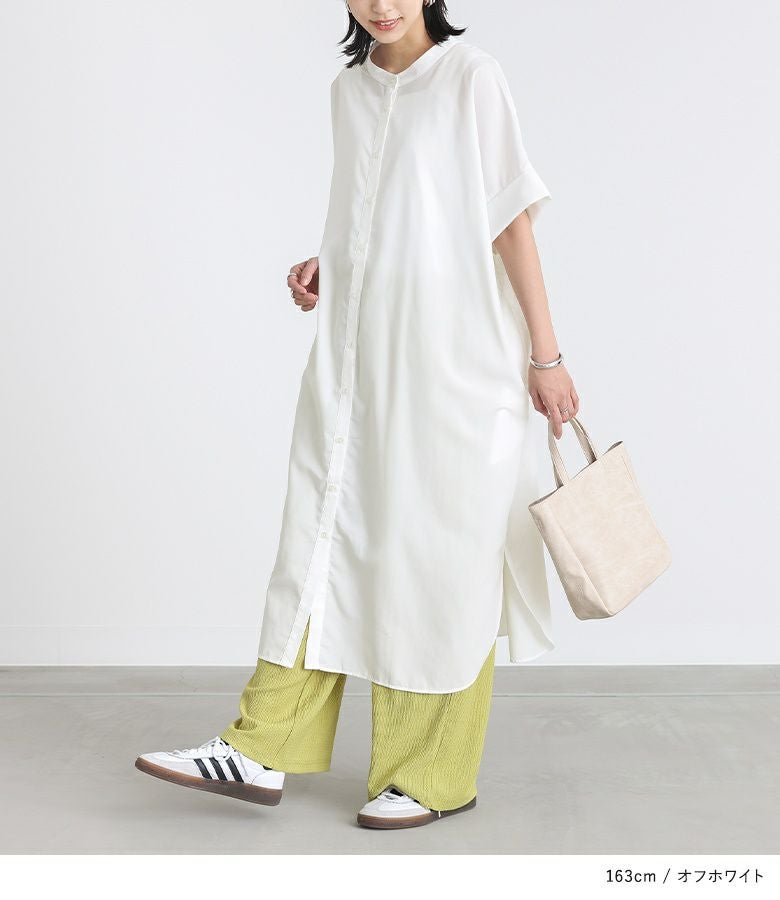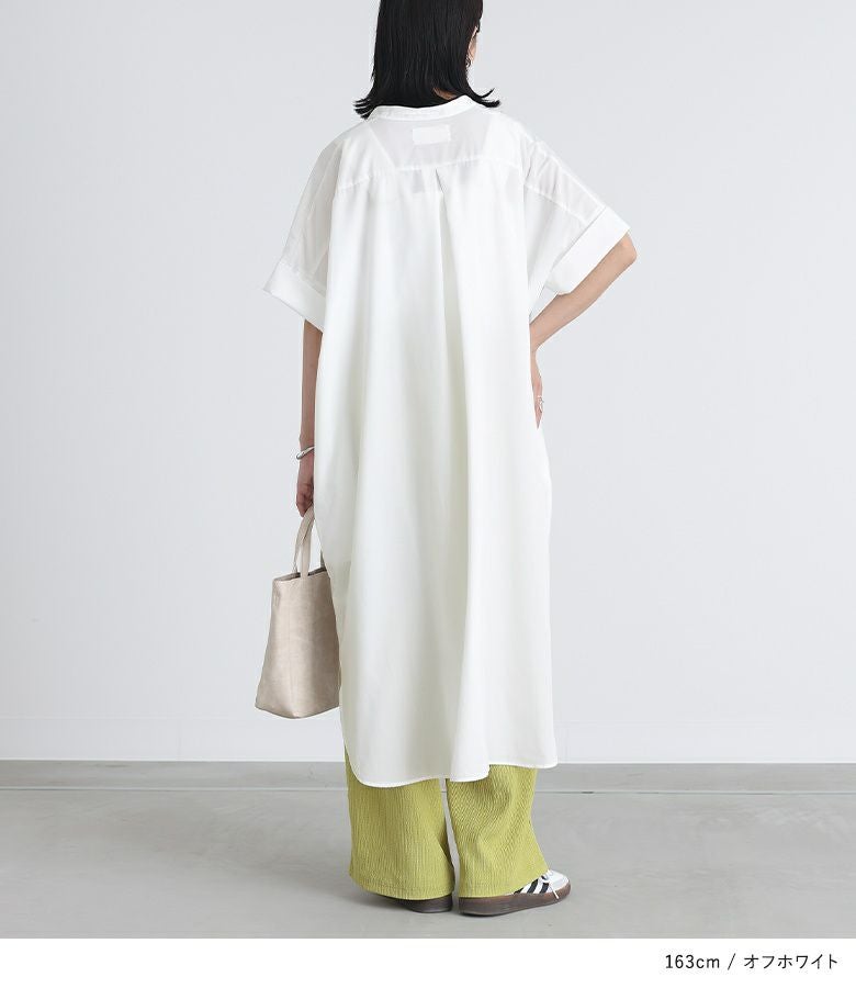 抜け感のあるバンドカラーと程良いロング丈がポイントのシャツワンピース。ボトムスと合わせて、レイヤードスタイルを楽しめる一枚です。袖口は折り返して丈感のアレンジが可能。両サイドにはポケット付きです。