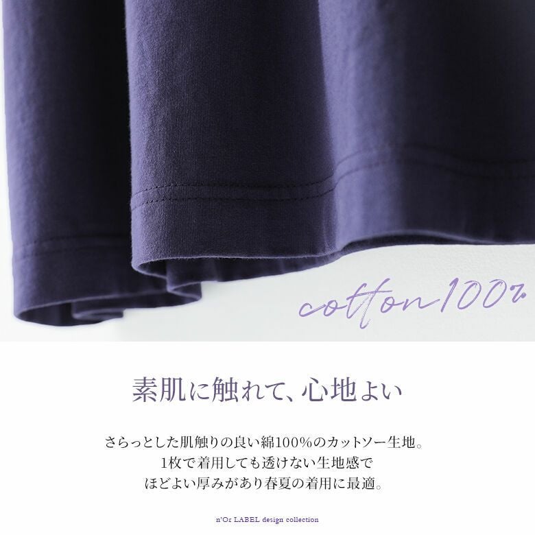素肌に触れて心地良いさらっとした綿100%のカットソー生地は、程よい厚みの透けない生地感で、快適な着心地を実現します。