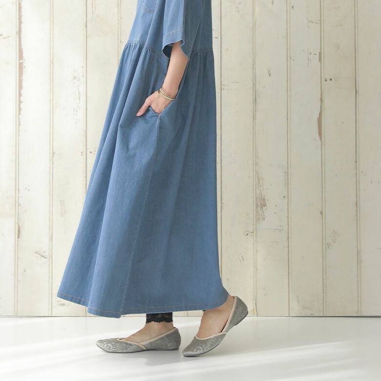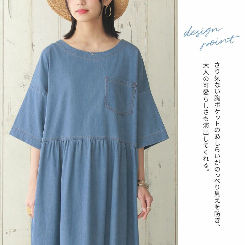 ゆったりドルマンのウエストギャザー仕様で、袖は折り返して5分袖見せもできる、ナチュラルな装いのデニムワンピースです。